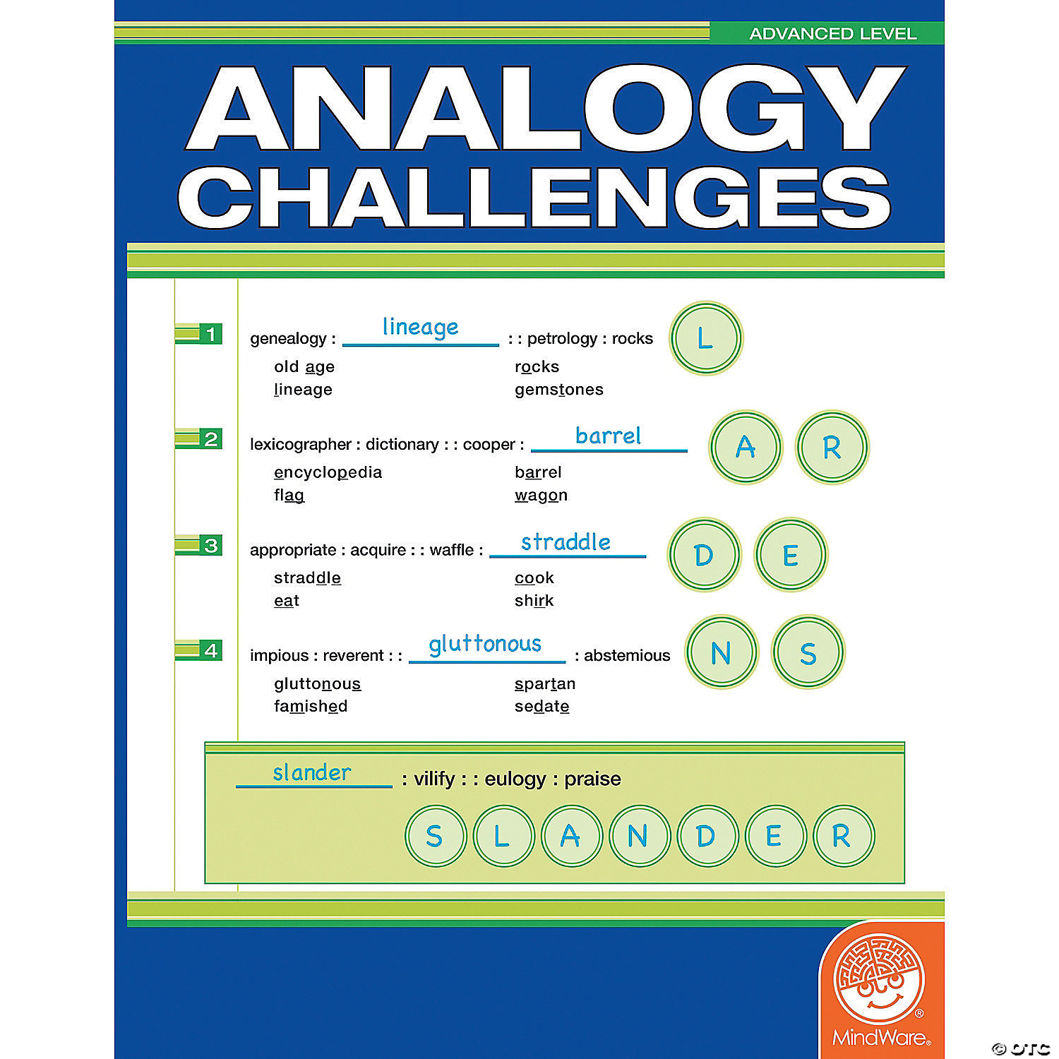 Analogy Challenges: Advanced Level help kids apply knowledge to new situations. These great puzzle books have four analogies to solve on each page; in turn, the answers provide hints for a fifth challenge-level analogy. Verbal and logic skills get a workout, with engaging graphics and fun puzzle-play feeling. 250 puzzles. Reproducible. Download Sample Page
