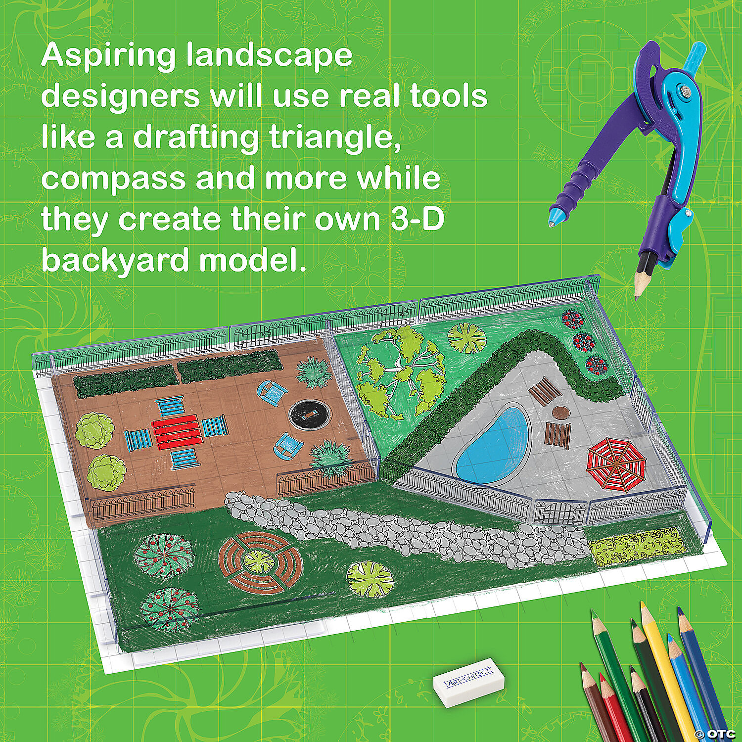 Let creativity blossom with each stroke of the pencil! Designers can craft serene gardens and sprouting parks with these tools of the landscape design trade. Armed with drawing tools, tracing paper, idea sheets and more, kids will enjoy the hands-on experience of designing a beautiful outdoor space for their 3D Art-chitect house (sold separately) or creating standalone natural masterpieces, all while learning valuable skills and having fun. A natural choice for nurturing minds, this set helps green thumbs and artistic talents grow as kids sketch, plan and build their botanical masterpieces!