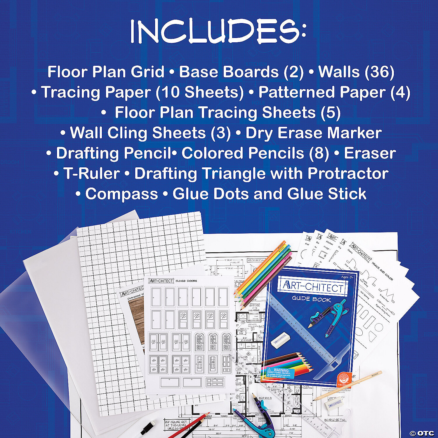 Inspire budding designers with a hands-on introduction to architecture for beginners. This engaging kit combines creativity and critical thinking as you learn real drafting skills while building 3-D designs from the ground up. Perfect for those exploring architecture for kids, this expansive set sparks the imagination as you use real architectural tools like a drafting triangle, compass and more to design, furnish and decorate floor plans using the detailed guidebook, static-cling doors and windows, furniture templates, drafting paper, 18" x 24" acrylic work surface, art supplies and more.