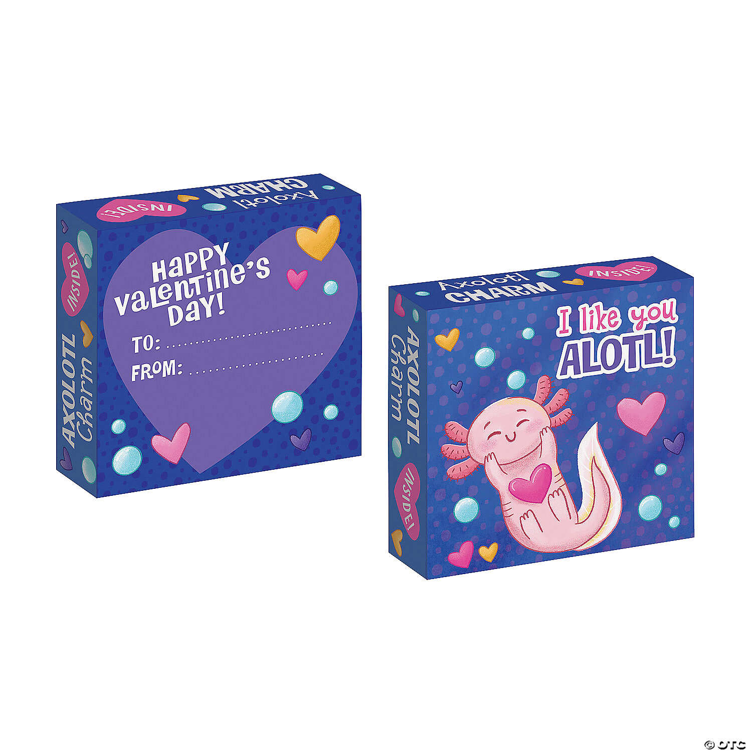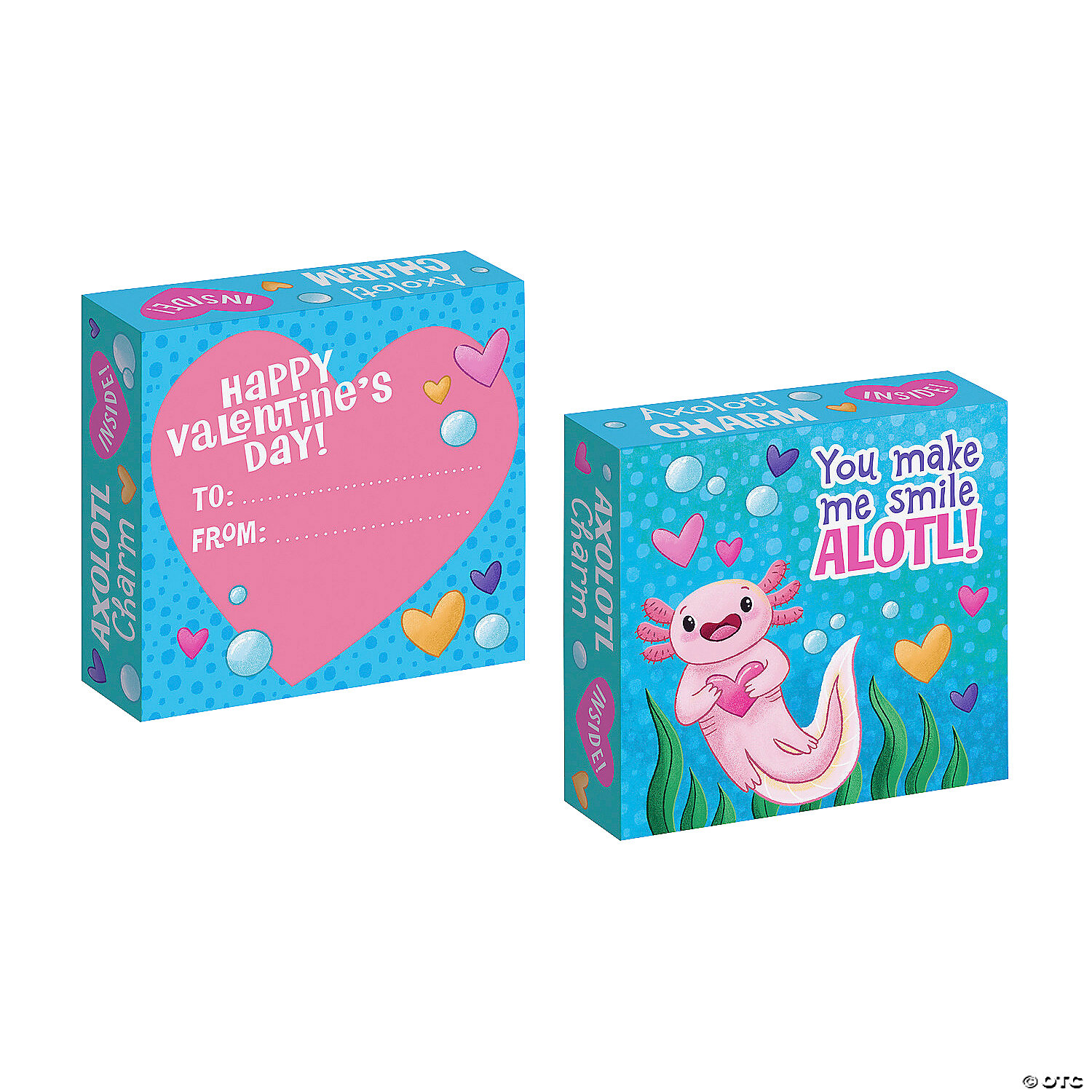 Axolotl Valentines with Charms: Set of 28 Mini Boxes