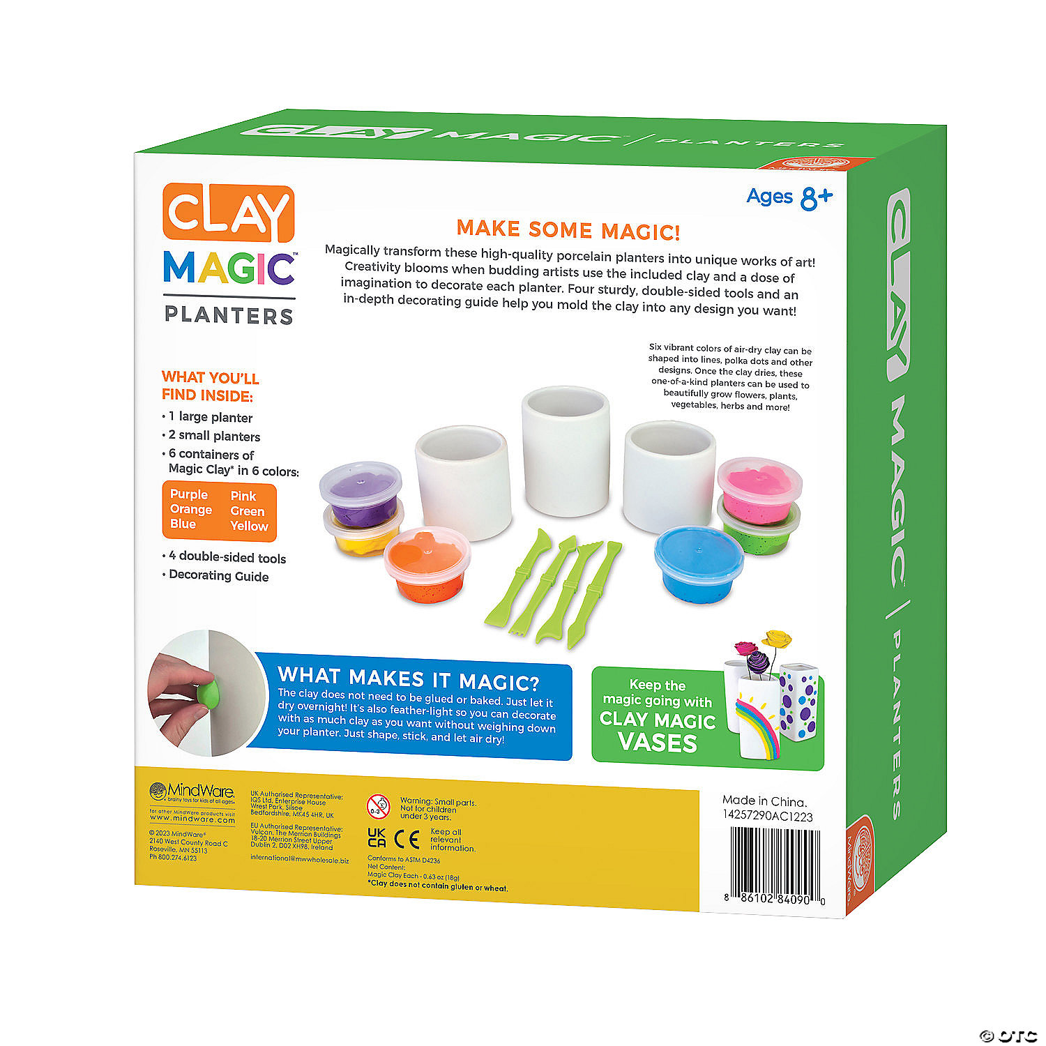 • Includes 1 large planter, 2 small planters, 6 containers of Magic Clay in 6 colors, 4 double-sided tools and decorating guide