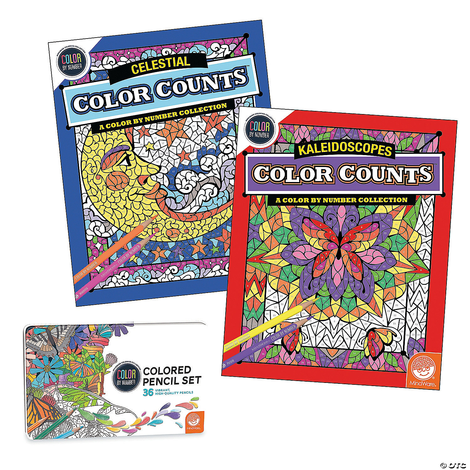 Our newest Color Counts coloring books incorporate a universal numbering system that pairs perfectly with our brilliantly-hued, 36-count Colored Pencil Set. Printed with coordinating numbers, the books and pencils are designed to make your coloring experience even more relaxing and enjoyable. Original, hand-drawn illustrations of kaleidoscopic and celestial scenes will reveal fantastic hidden details as you color. Once you've completed the numbered designs, try the un-numbered version of the illustration to add your own unique style. Each design, printed on artist-quality paper, creates a frame-worthy finished product! Both books feature 22 perforated pages including 8 fold-out pages that extend to a 10" x 15" size. Perfect for gift-giving, this set includes 36 pencils in an embossed tin. With a carefully selected assortment of classic colors and contemporary hues, the artist-quality pencils add both bold, precise details and soft blends to the colored page, while triangular barrels provide for a comfortable grip. Color names and numbers are printed right on each pencil.