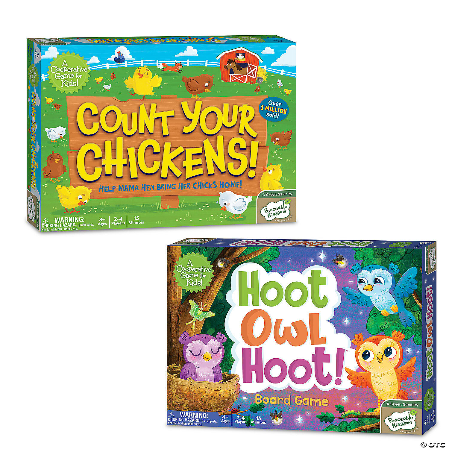 Cooperative games help kids learn to play well together. Build your collection with two favorites that can be adapted for younger and older kids.Includes 2 games:In Count Your Chickens, players spin and move, and count chicks to help mother hen bring them back to the coop. If you collect all the chicks, then everyone wins! Includes 1 game board, 1 mother hen with stand, 40 baby chick markers, 1 spinner and instructions.In Hoot Owl Hoot, players help the owls fly back to their nest before the sun comes up. Play a color card and fly to that space. Draw a sun card, and you’re one step closer to the daylight. Includes 1 game board, 6 owl tokens, 1 sun token, 14 sun cards, 36 color cards and instructions.• Cooperative games empower young learners and teach teamwork and basic game play• Kids practice counting and colors• Easy for beginners, with addable challenges as players grow• Parent guide included • Perfect for home or classroom use