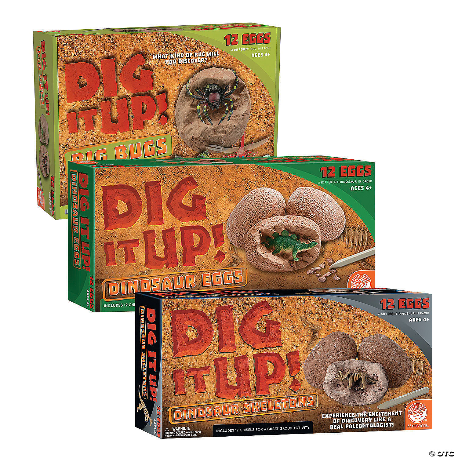 Bring home the mystery and excitement of a paleontological dig! Each of these three Dig It Up! Discovery packs include 12 individually-wrapped dig projects, each with its own chiseling tool and instructions, making it the perfect excavation activity for a classroom or party! Just soak each 3" clay pod in water, then chisel away to discover your unique find. Check the included excavation guide for fun facts about your finds, plus extra activities!Includes 3 kits:Dig It Up! Big Bugs: excavate 12 bug eggs and learn about each insect, from a grasshopper to a scorpion!Dig It Up! Dinosaur Eggs: excavate 12 dino eggs and learn about each dinosaur, from a Spinosaurus to a T-Rex!Dig It Up! Dinosaur Skeletons: excavate 12 dino skeletons and learn more about each prehistoric reptile!• Experience the thrill of discovery with 12 dig-and-discover projects per kit!• Each clay pod contains a different unique bug, dino or dino bones toy• A hands-on lesson in science and the natural world for kids• Excavation guide includes exciting information about your finds, plus fun activities• Perfect for a class, big group or party activity!