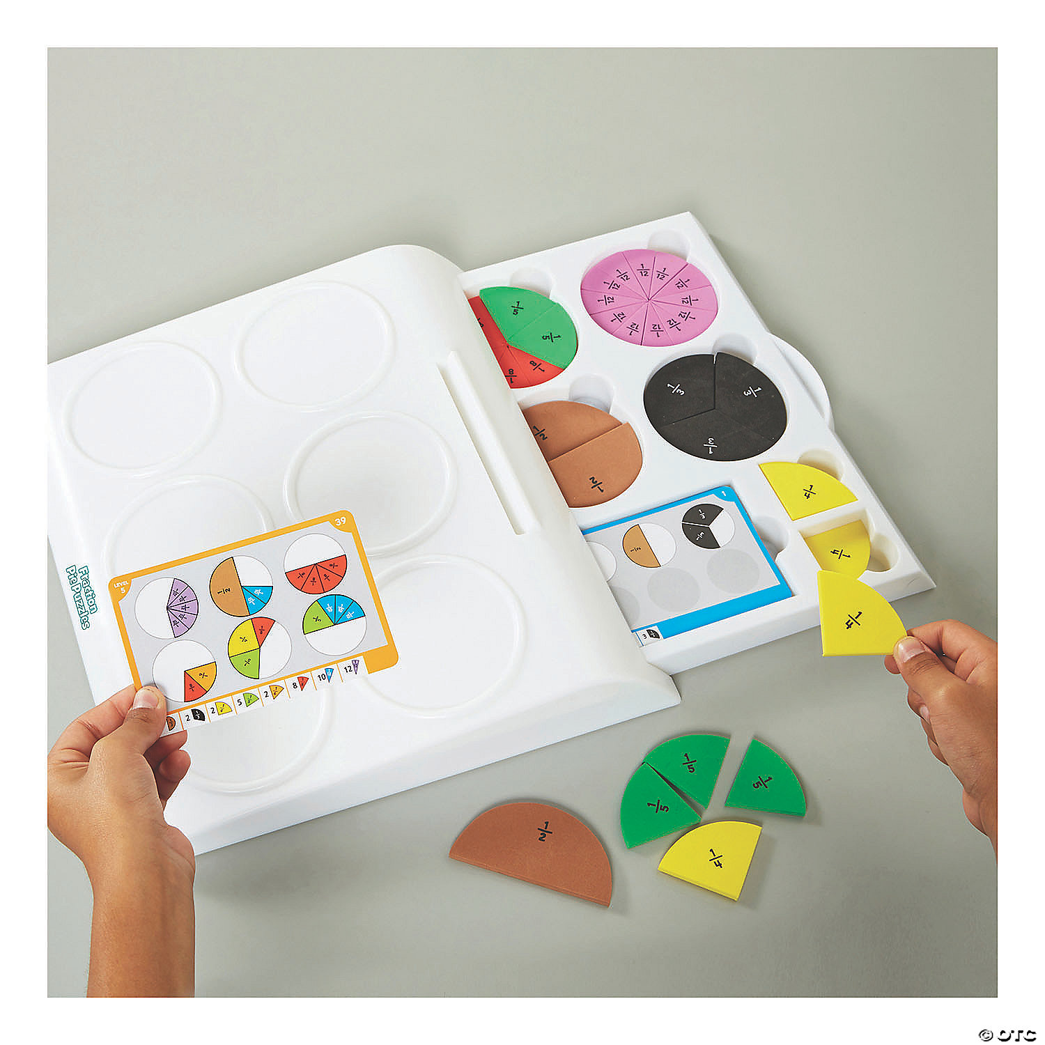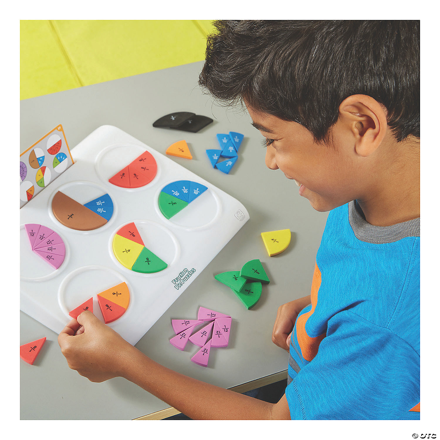 Making fractions "easy as pie." Each Fraction Pie Puzzle is a puzzle and a conceptual fraction lesson, all rolled into FUN! Select a card, place the starting pieces, and then complete the circles with the remaining fraction pie pieces. Will one-third solve the puzzle? What about 2 one-sixths? This kinesthetic way to reinforce basic fraction concepts teaches students how fractional parts make up a whole and about equivalencies, common denominators, and multiples. Leveled from easy to difficult and self-correcting, the puzzles are perfect as a small group or center activity. It's an entertaining way for students to challenge their brain and understand fractions! Includes game board, 50 leveled puzzle cards (easy to challenging), 65 foam fraction pieces, and guide. Solutions included for every puzzle. For 1 to 2 players. Special Shipping Information: This item ships separately from other items in your order. This item cannot ship to a P.O. Box. ITEM IS NOT ELIGIBLE FOR EXPEDITED SHIPPING