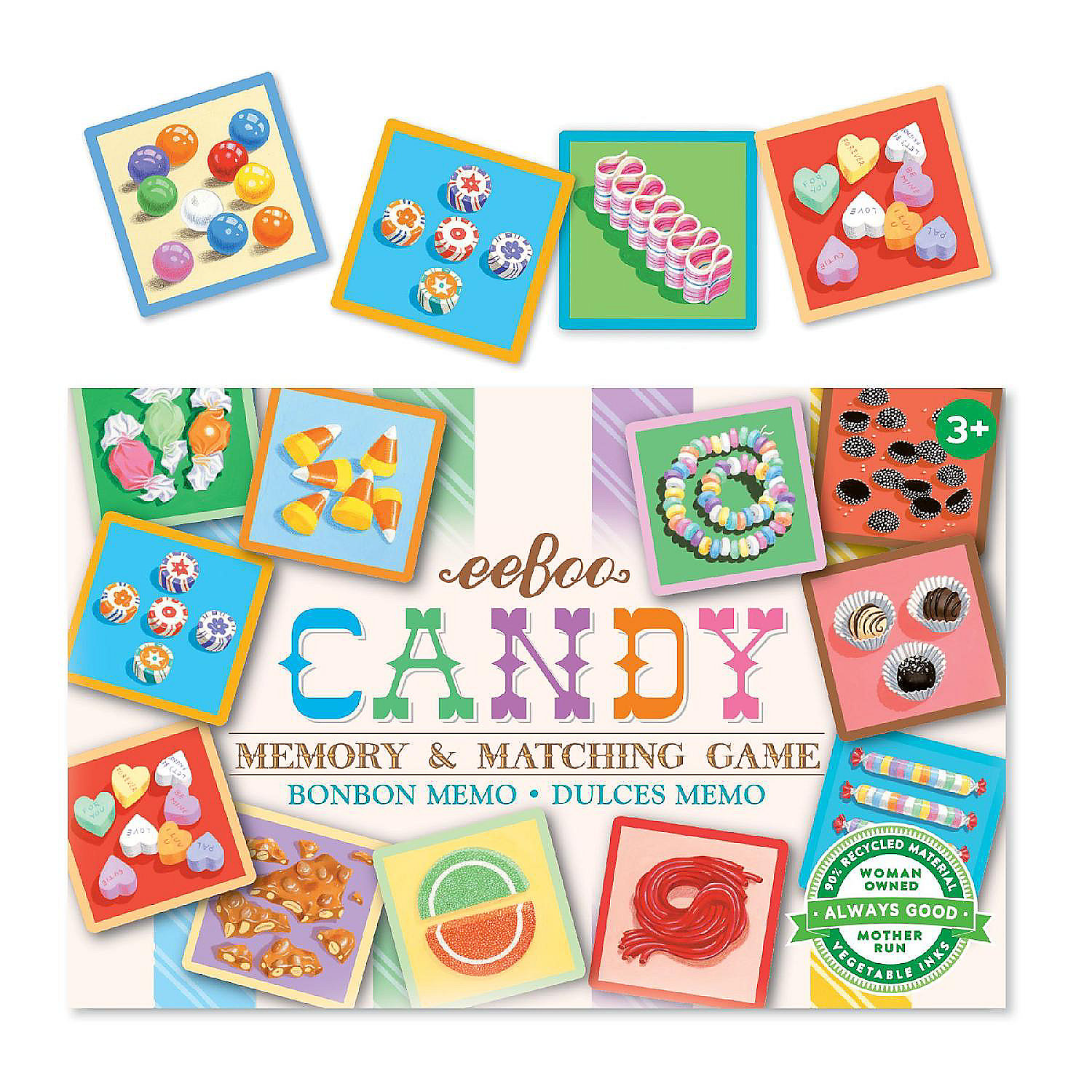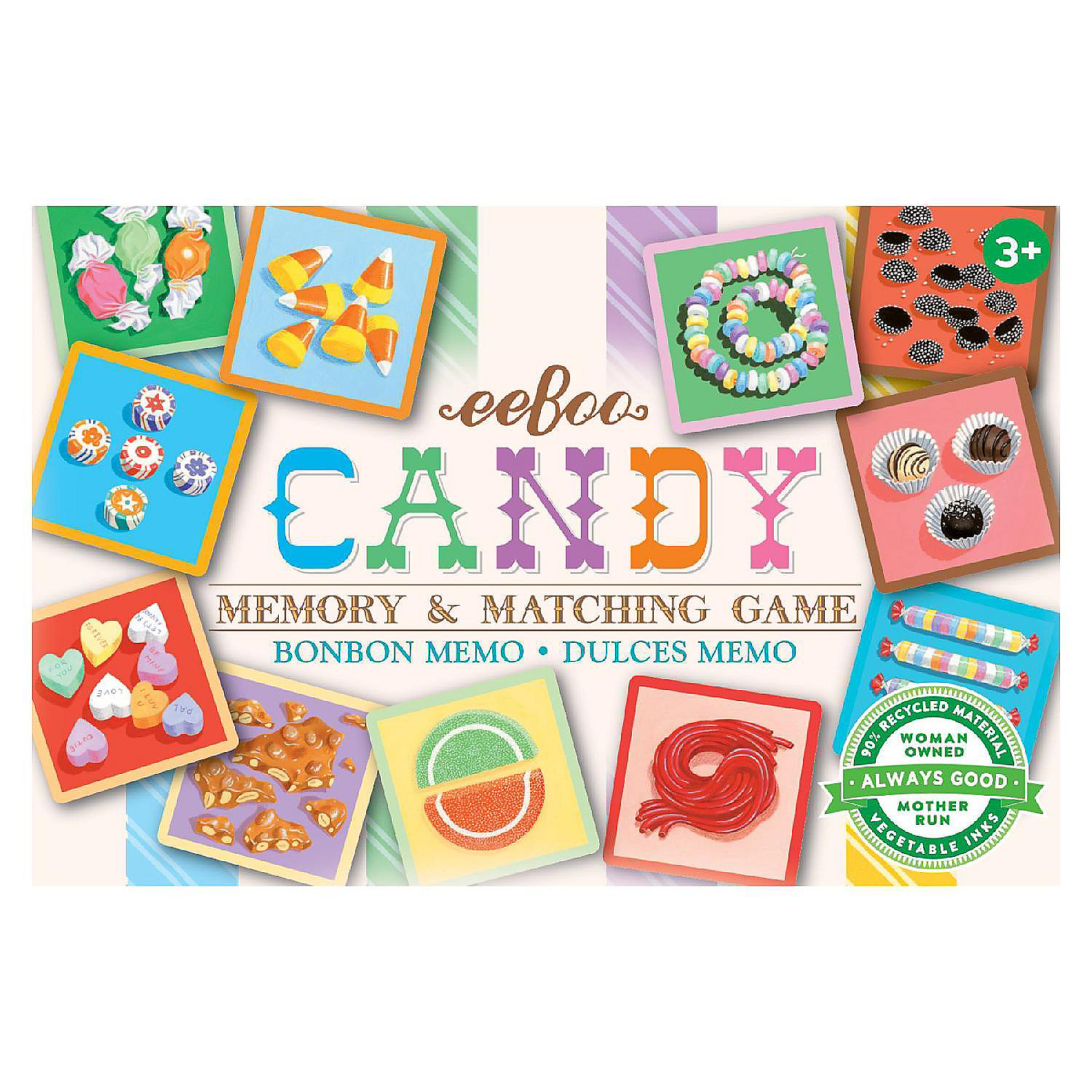 Candy Memory and Matching Game is sweet little game, perfect to toss in a bag and take on-the-go. Test your memory by trying to match pairs of candy corn, colorful taffy and other classic candies. Satisfy a sugar craving without risking a trip to the dentist. Game includes eighteen pairs of candy style tiles to match. Illustrated by Lizzy Rockwell. We are a women-owned business dedicated to sustainability, safety, and the creation of original and extraordinary gifts and toys. This item is made of 90% recycled materials, printed with vegetable-based inks. For over 25 years, eeBoo has created wholesome, educational games and activities that cultivate conversation, socialization, and skill-building while introducing our world.Not Eligible for Air Shipping.