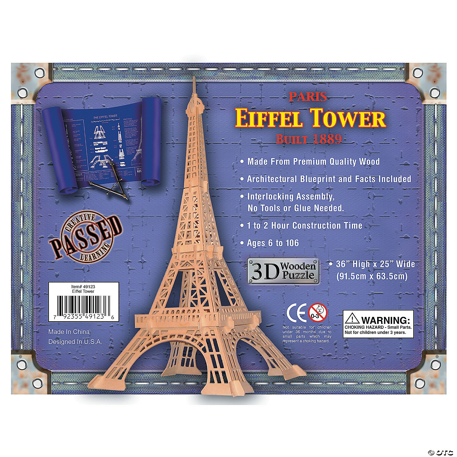 Young builders hone their visual perception and engineering skills while assembling this famous monument. The Eiffel Tower construction blueprints add to the fun and challenge; precision-cut pieces made of premium basswood interlock easily, so no tools are required. Weighs just 3 lbs. Approximate scale: 1' equals 350'. 32 pieces.• Made from premium quality wood• Architectural blueprint and facts included • Interlocking assembly • No tools or glue needed• One to two hours construction time• 36" high X 25" wide Download Instructions