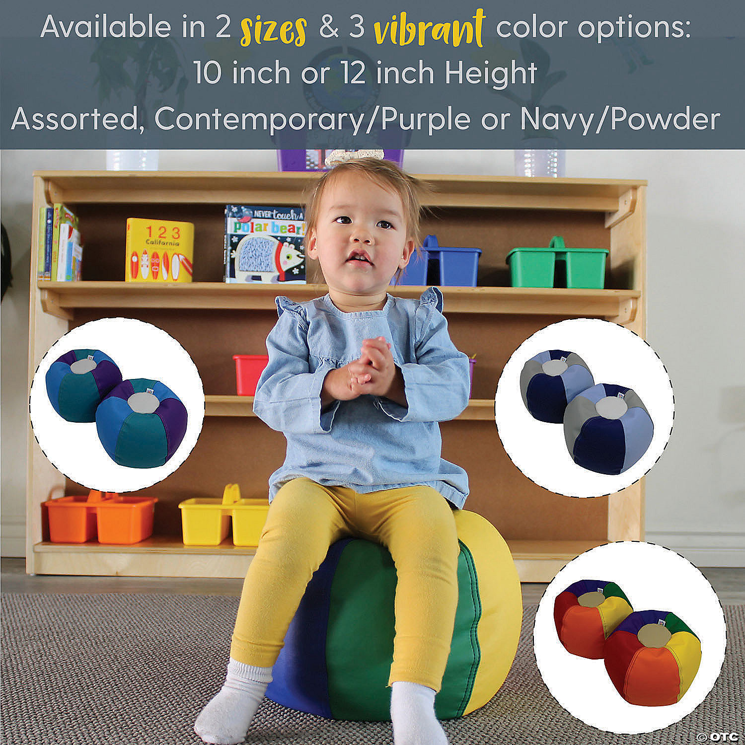 Toddlers and preschoolers will love SoftScape Puffs Bean Bag Seats. Vibrant and fun, seats come in a pack of 2; perfect for sitting with your best friend or sibling for stories, snacks or playing games. Soft and lightweight, kids can easily pick up or roll their puff to his or her favorite spot. Puffs feature double-stitched seams for durability and two child-proof locking zippers to keep beads safely inside. Textured non-slip bottom keeps seats safely in place while in use. The soft, leather-like polyurethane material is durable and easy to maintain — just wipe clean with mild soap and water solution. 10" height recommended for kids age 2-4 years old. Special Shipping Information: This item ships separately from other items in your order. This item cannot ship to a P.O. Box. This item may be subject to additional processing days. ITEM IS NOT ELIGIBLE FOR EXPEDITED SHIPPING