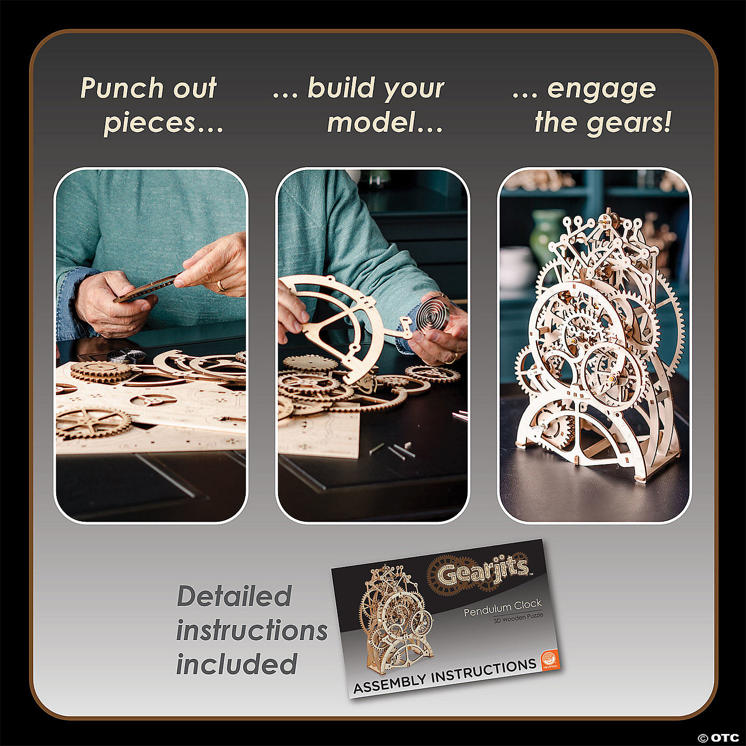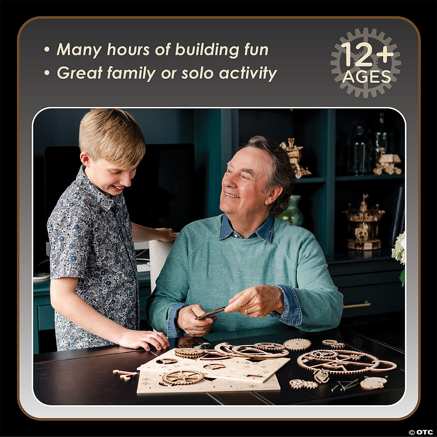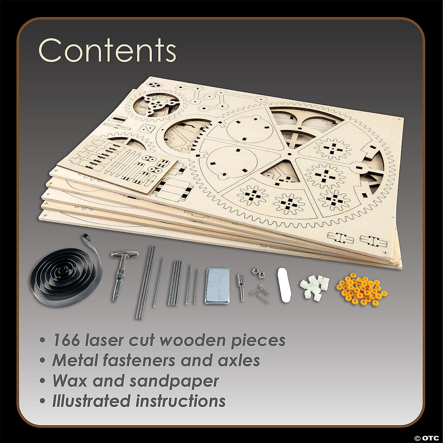 Challenge yourself and build an intricate, working clock from beautiful, laser-cut wood pieces. This 3D vintage clock is exciting to build, and the final product brings the principles of mechanics to life. Just set the system of gears, rods and wheels in motion, and enjoy artistic mechanics that keep time. What will happen when the clock strikes midnight? Average building enthusiasts can complete the puzzle in about 4 hours.• Build a 13” tall wooden clock with no glue and no tools!• Awe-inspiring finished form well beyond the norm for construction toys• Combines all the benefits of traditional building sets with principles found in leading STEM toys• Develops fine motor skills, creativity, perseverance and dexterity• Includes 166 pre-cut pieces and detailed, easy-to-follow instructions