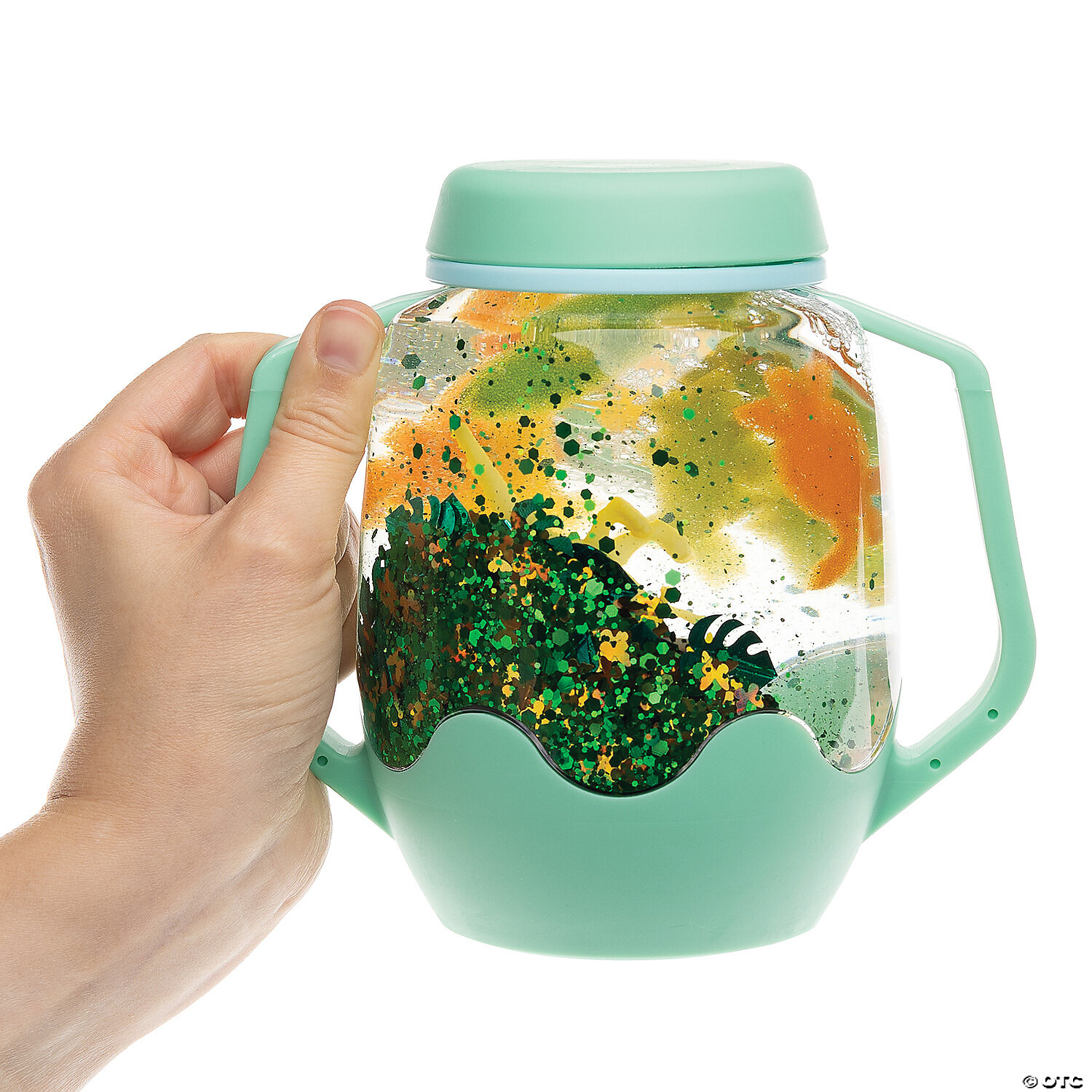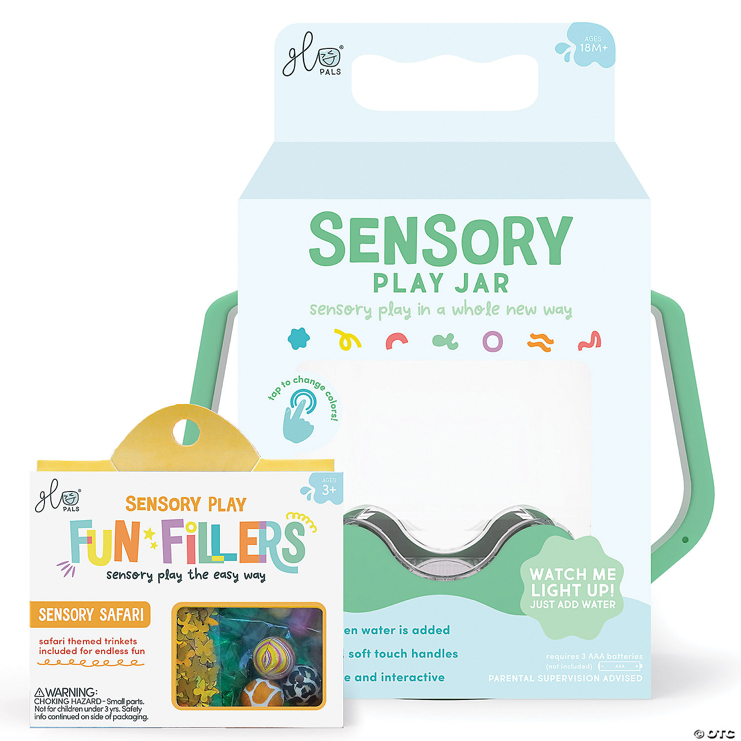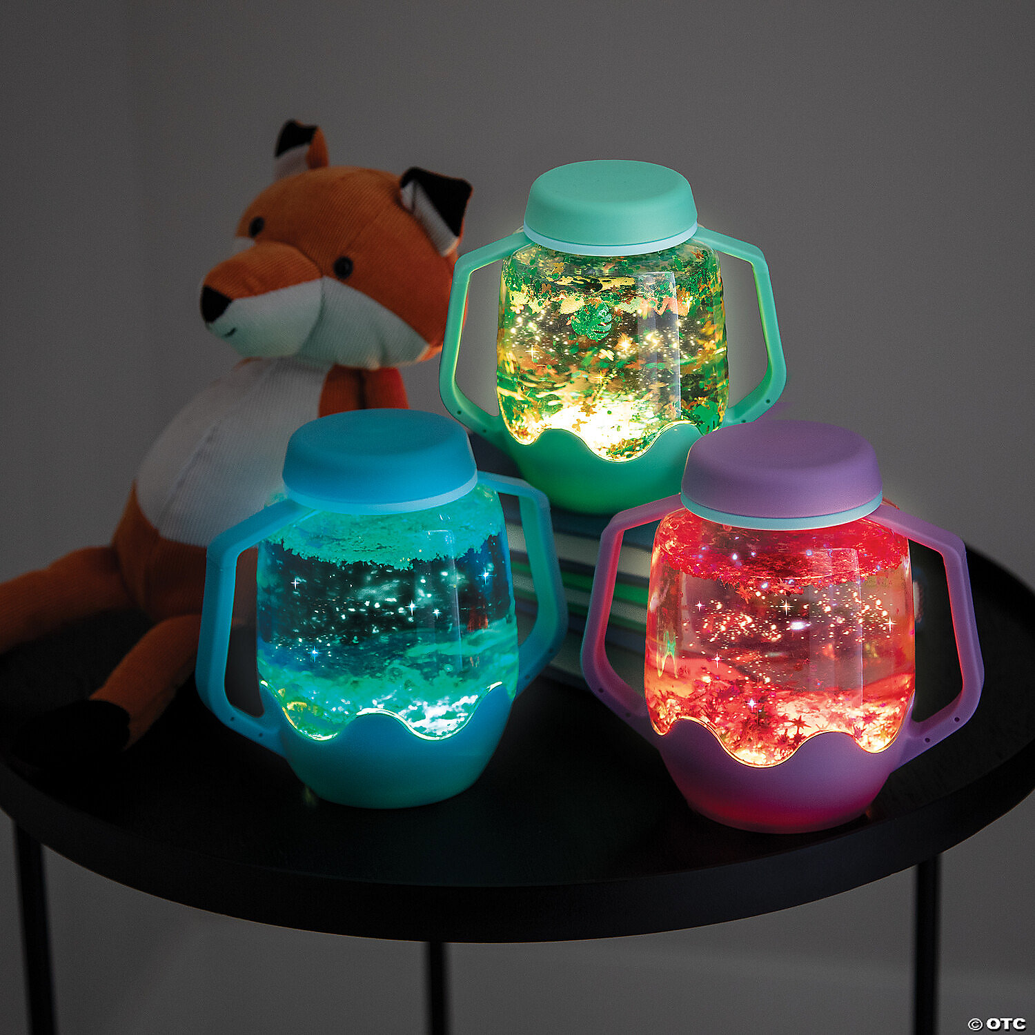 This award-winning sensory glow jar includes an assortment of toy play objects, foam floaties, glitter and other tactile delights, all brought to life with a soft, illuminating glow. Flip jars up and down for a soothing effect that's perfect for both daytime sensory play and nighttime tranquility.