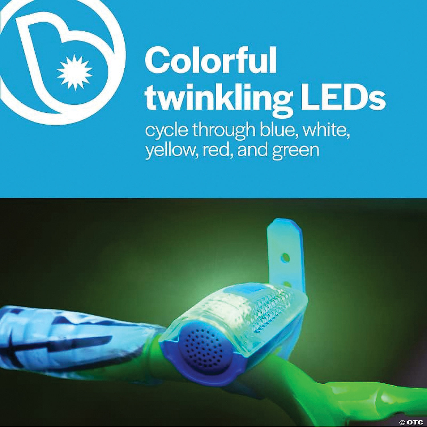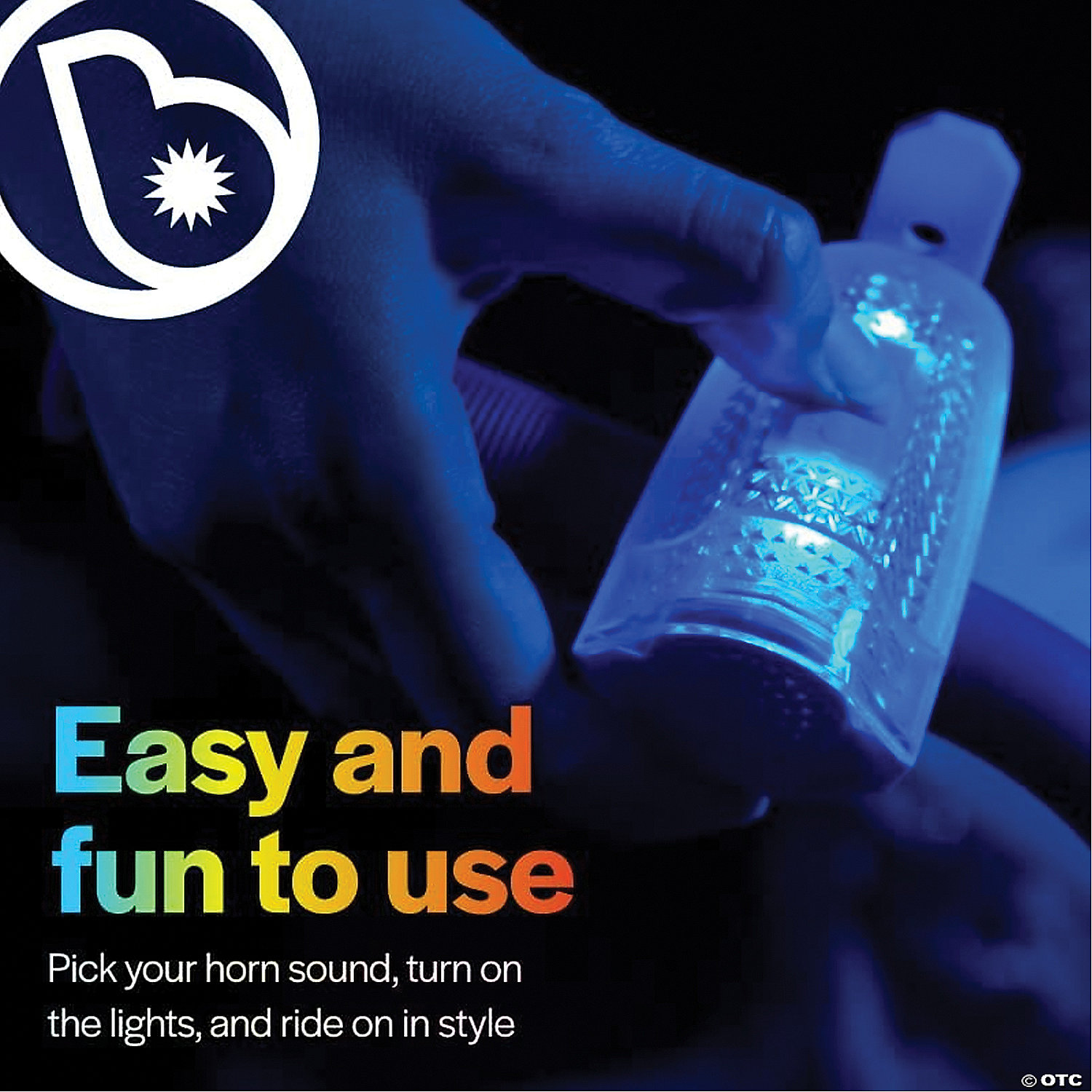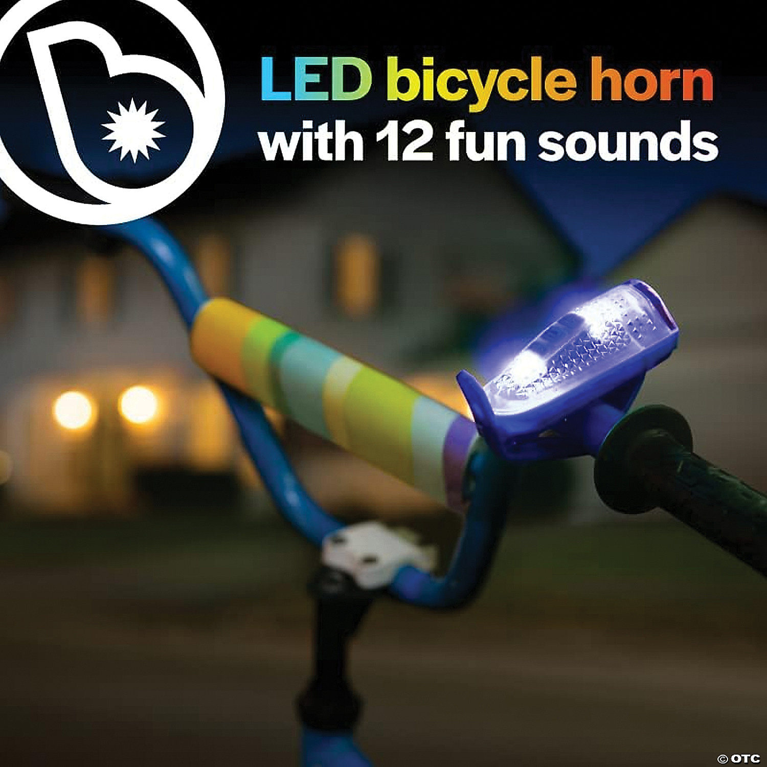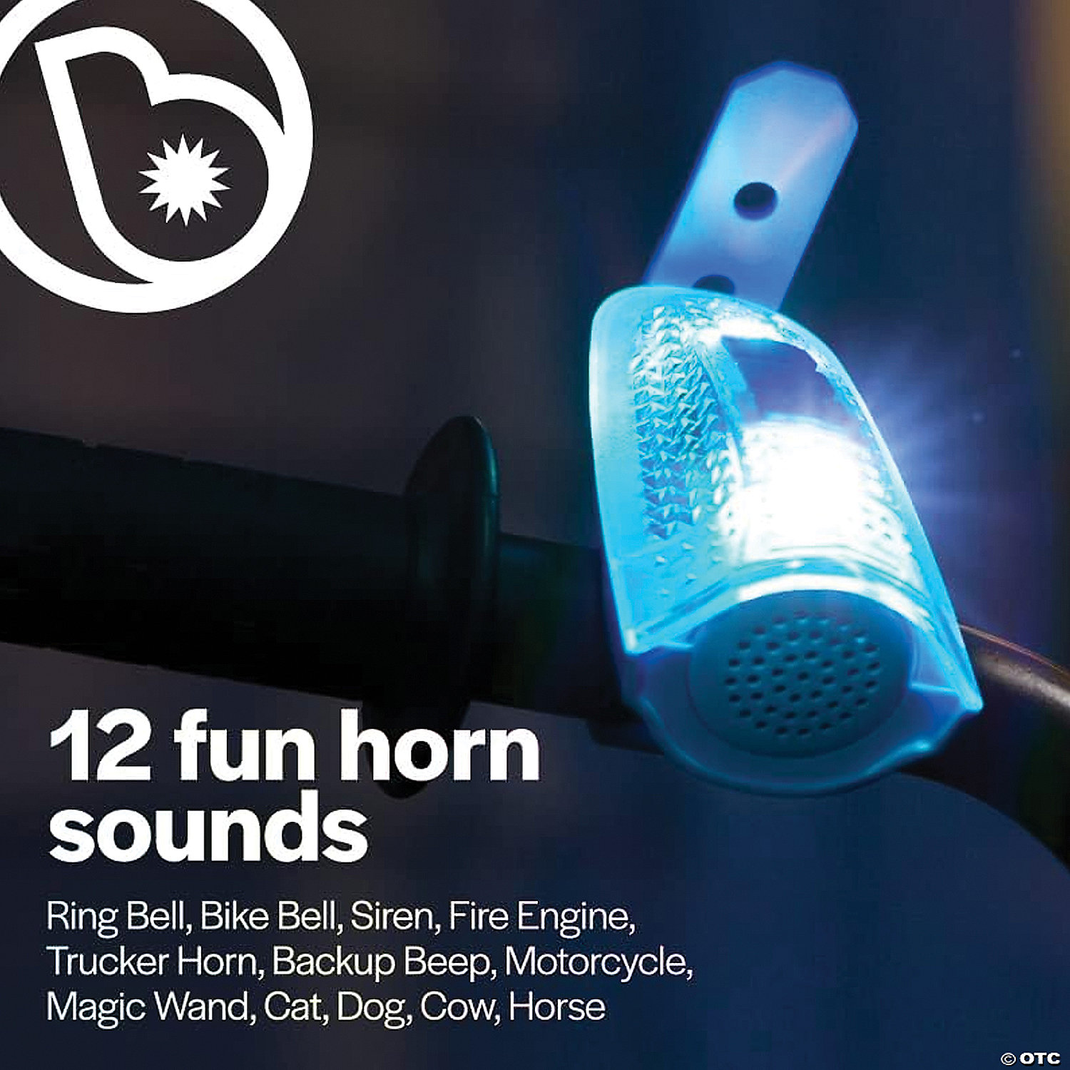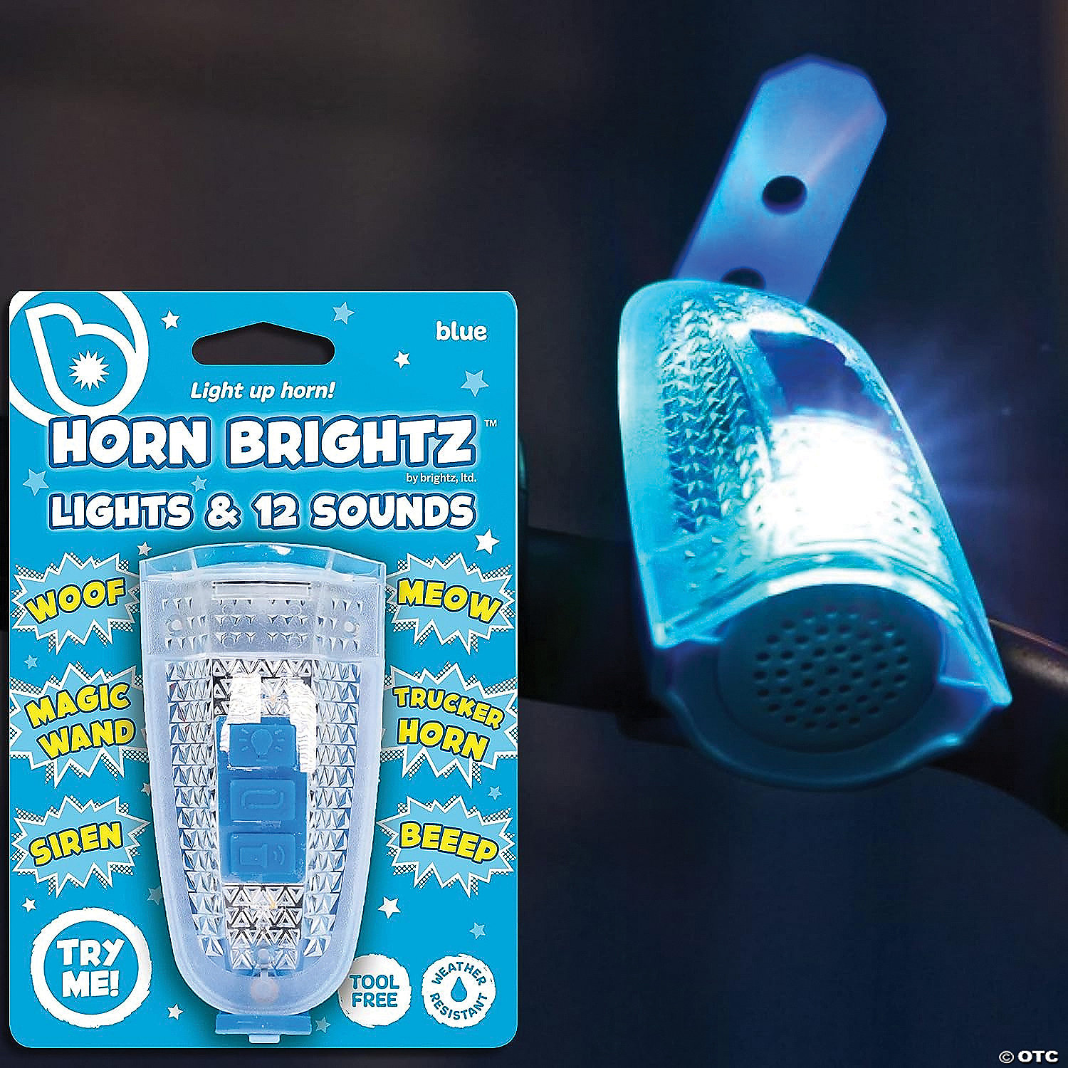 Announce your arrival in style! Hornbrightz is a LED bicycle horn with 12 fun sounds! Find your sound, turn on the lights, and ride on. This weather-resistant horn is easy to install and no tools are required. Requires 2 AAA batteries. Sounds include: Ring Bell, Bike Bell, Siren, Fire Engine, Trucker Horn, Back-Up Beep, Motorcycle, Magic Wand, Cat, Dog, Cow, Horse. Recommended for ages 5 and up.