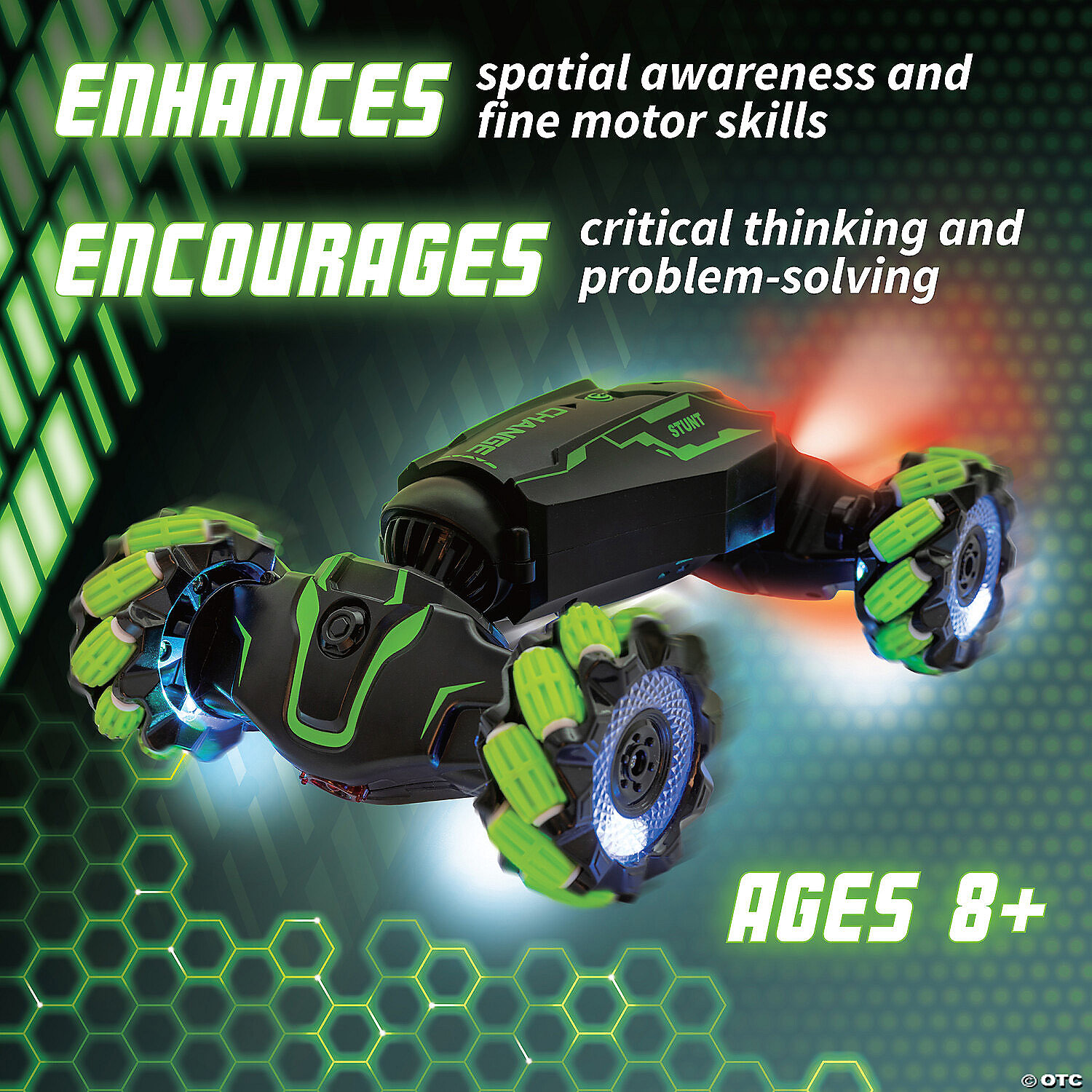 At the touch of a button, this dynamic remote control car shifts from a rugged all-terrain explorer to a high-speed racer! A remarkable fusion of cutting-edge technology and robust design, this souped-up stunt car features glowing, multicolor Mecanum wheels that defy traditional movement constraints. Set up an obstacle course with the included cones, then use the remote to control every aspect of its performance, from playing roaring sound effects and music through high-quality speakers to switching between climbing and racing modes to activating the jet-like exhaust. Experience the dynamic blend of education in physics and sheer exhilaration that’s perfect for race car enthusiasts ages 8 and up. Remote control requires 2AA batteries (not included).