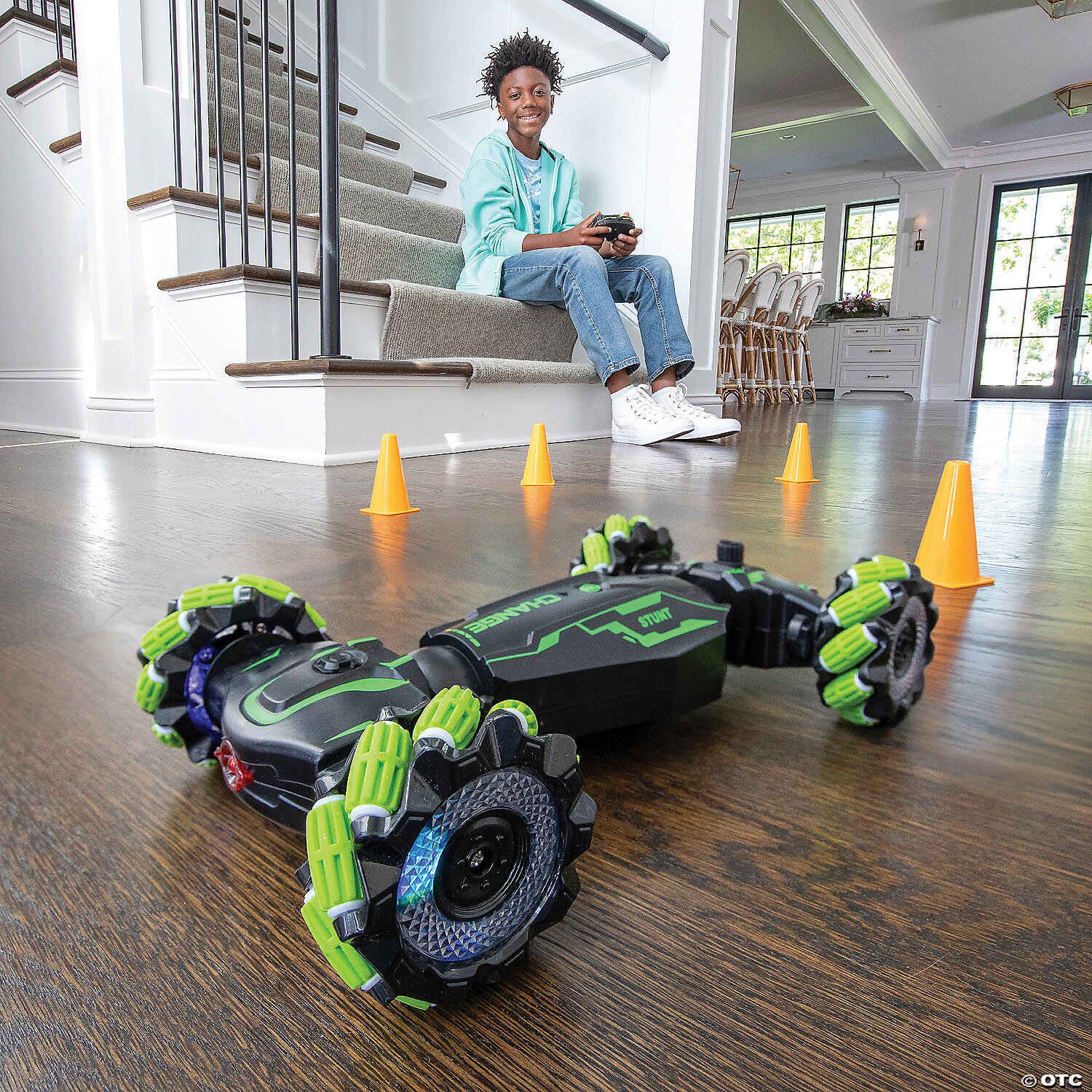 At the touch of a button, this dynamic remote control car shifts from a rugged all-terrain explorer to a high-speed racer! A remarkable fusion of cutting-edge technology and robust design, this souped-up stunt car features glowing, multicolor Mecanum wheels that defy traditional movement constraints. Set up an obstacle course with the included cones, then use the remote to control every aspect of its performance, from playing roaring sound effects and music through high-quality speakers to switching between climbing and racing modes to activating the jet-like exhaust. Experience the dynamic blend of education in physics and sheer exhilaration that’s perfect for race car enthusiasts ages 8 and up. Remote control requires 2AA batteries (not included).