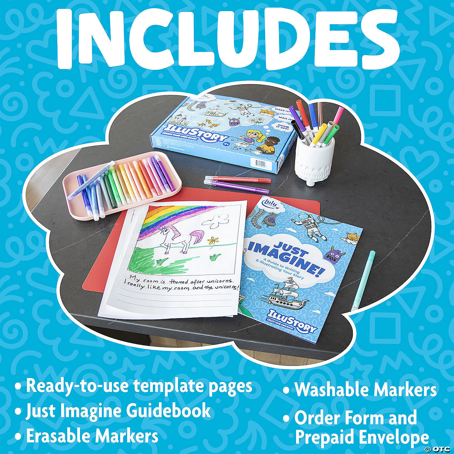 • Contains ready-to-use cover template pages, story and illustration template pages, guide book and instructions, a set of color markers and a postage-paid envelope and order form