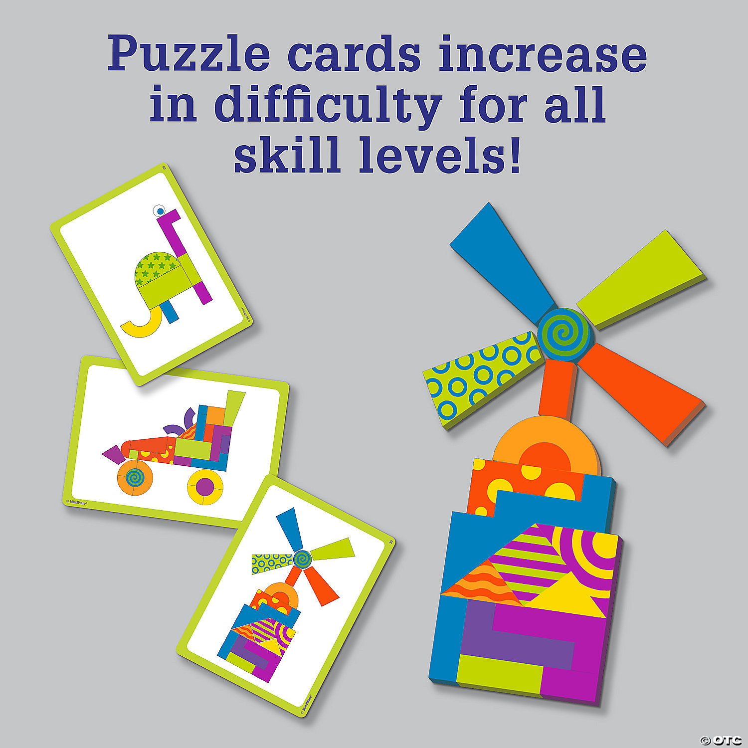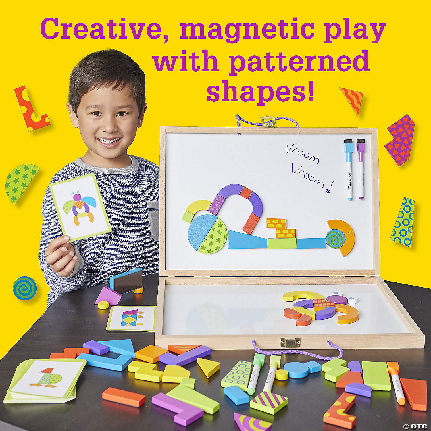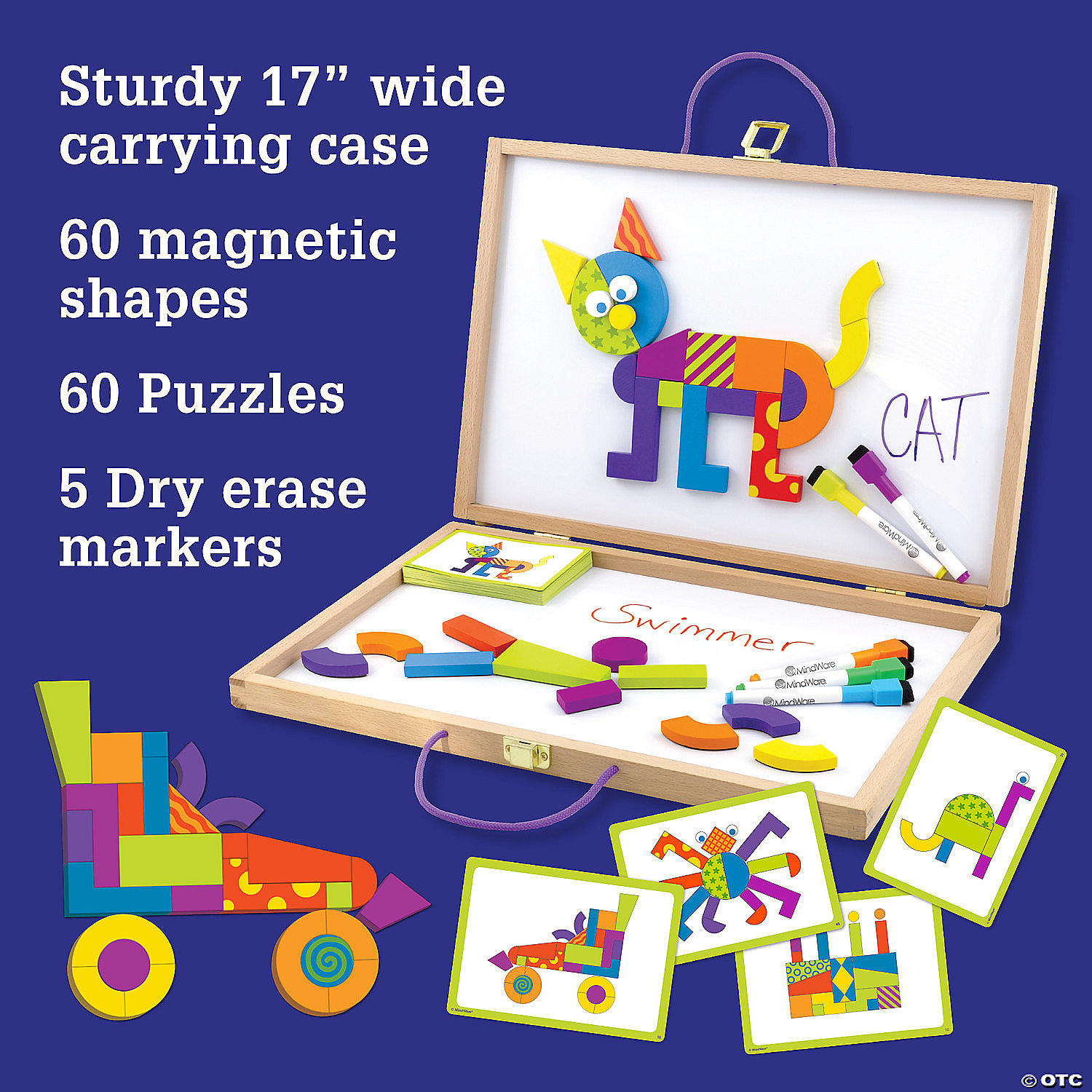Our deluxe magnet design set is a sure-fire way to boost your children's fine motor and visual-thinking skills! This building tool features a 11.5" tall x 17" wide x 1" deep sturdy wood carrying case with durable hinges and rope handles. Inside, a combination of 60 brightly-colored solid and patterned wooden magnets can be arranged on the board to replicate any of the 60 all-new, full-color puzzles such as animals, faces, vehicles, flowers, structures and more. The pattern cards are numbered in order of difficulty, ranging from beginner to expert. As patterns become more challenging, patience and confidence are gained through trial and error. Plus, the magnetic surface doubles as a dry-erase board that can be decorated with the five included dry-erase markers. Once recreating the patterns has been mastered, creativity takes over through free play, inspiring hours of imagination!