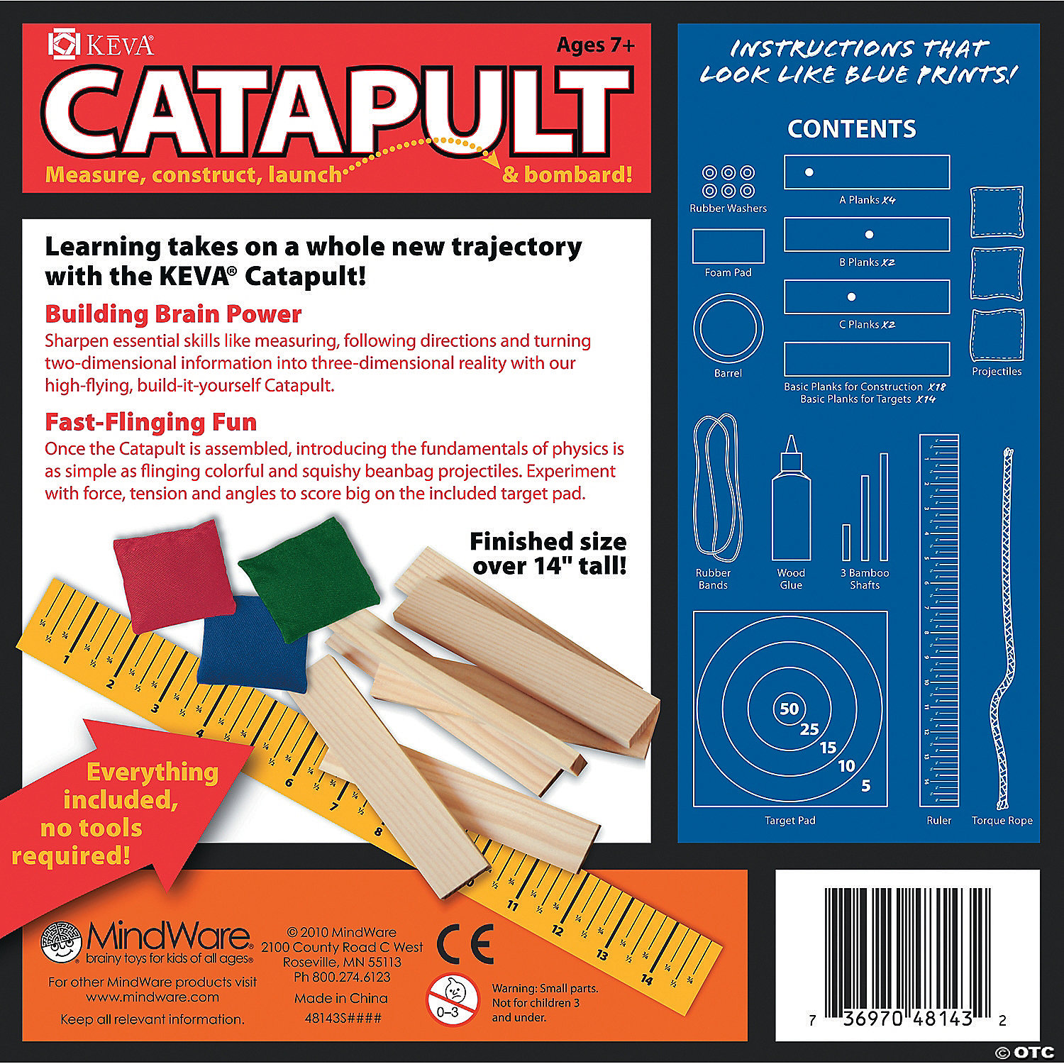 Build your own authentic catapult with planks, a little glue and the help of easy, step-by-step instructions. Then let the fun and experiments begin! What shoots farther, a marshmallow or a piece of macaroni? How does the objects course change when you pull the arm back to different points? If you make the flight deck higher, how does it affect the hurl? Includes pre-drilled planks, wood glue, leather strap, ruler, rubber bands, cup, 2 balls, target mat, fasteners and instructions. Download Instructions