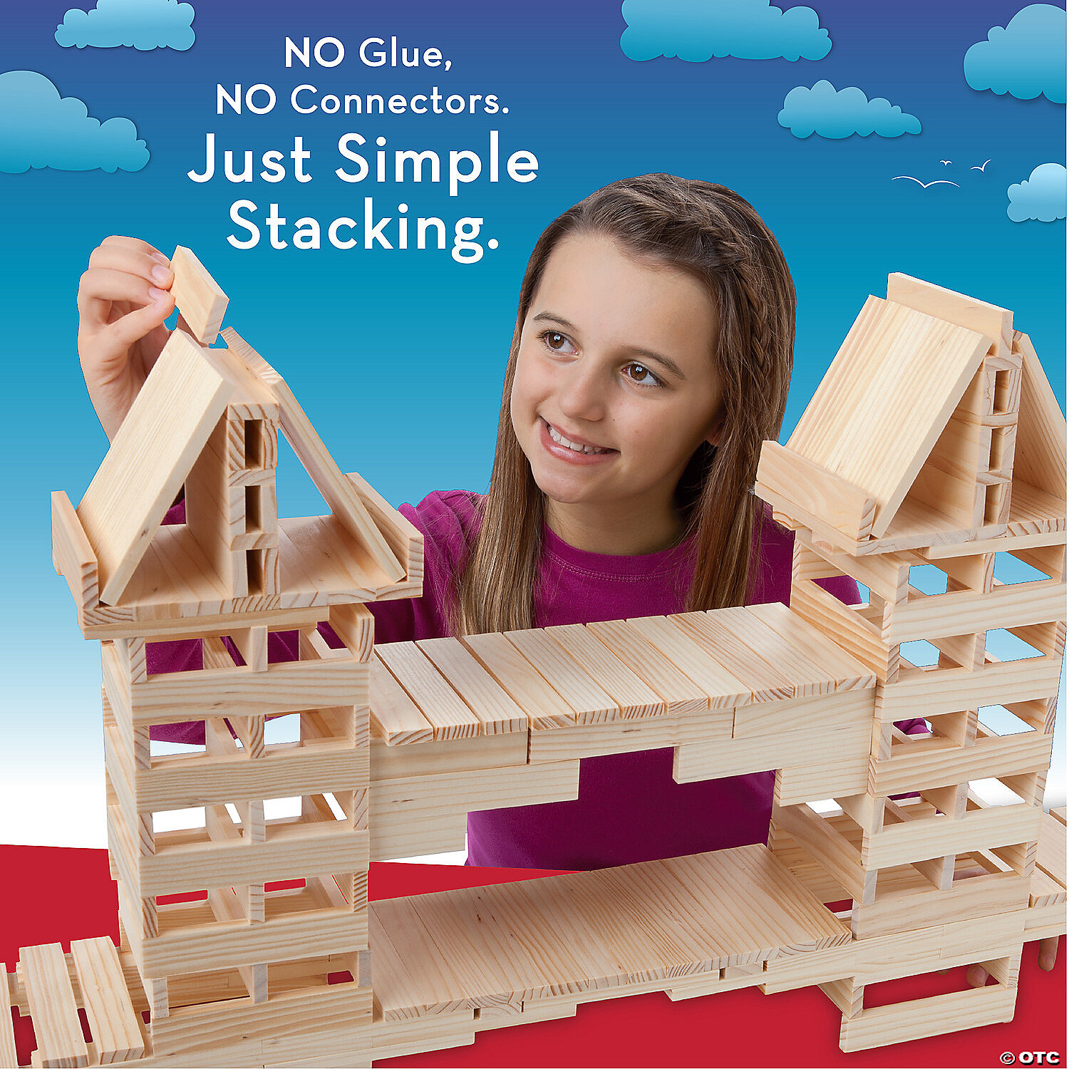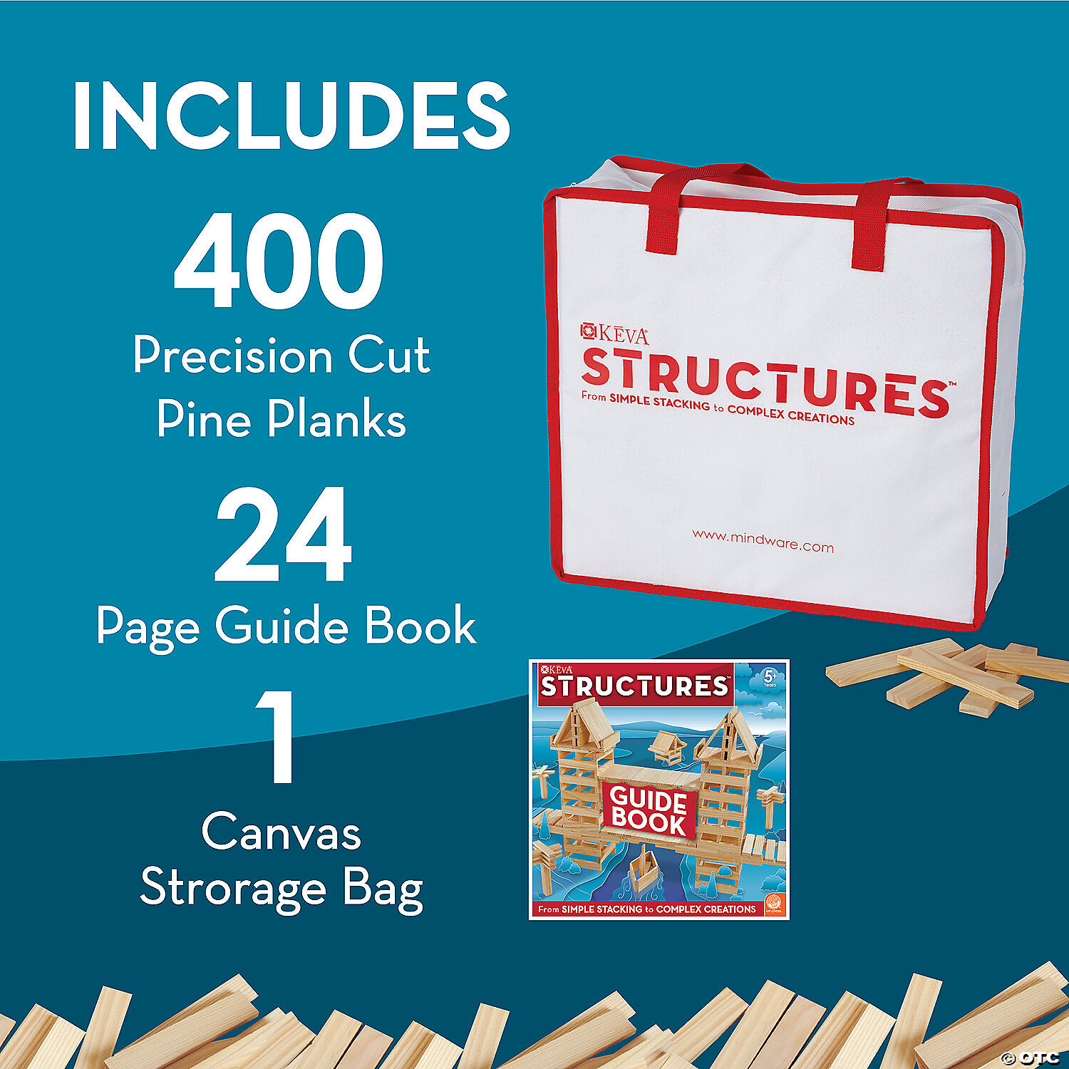 KEVA Structures 400-piece plank set comes with 400 wooden planks, a canvas zippered storage bag and an 18-page idea book with project photos and quick-start instructions.