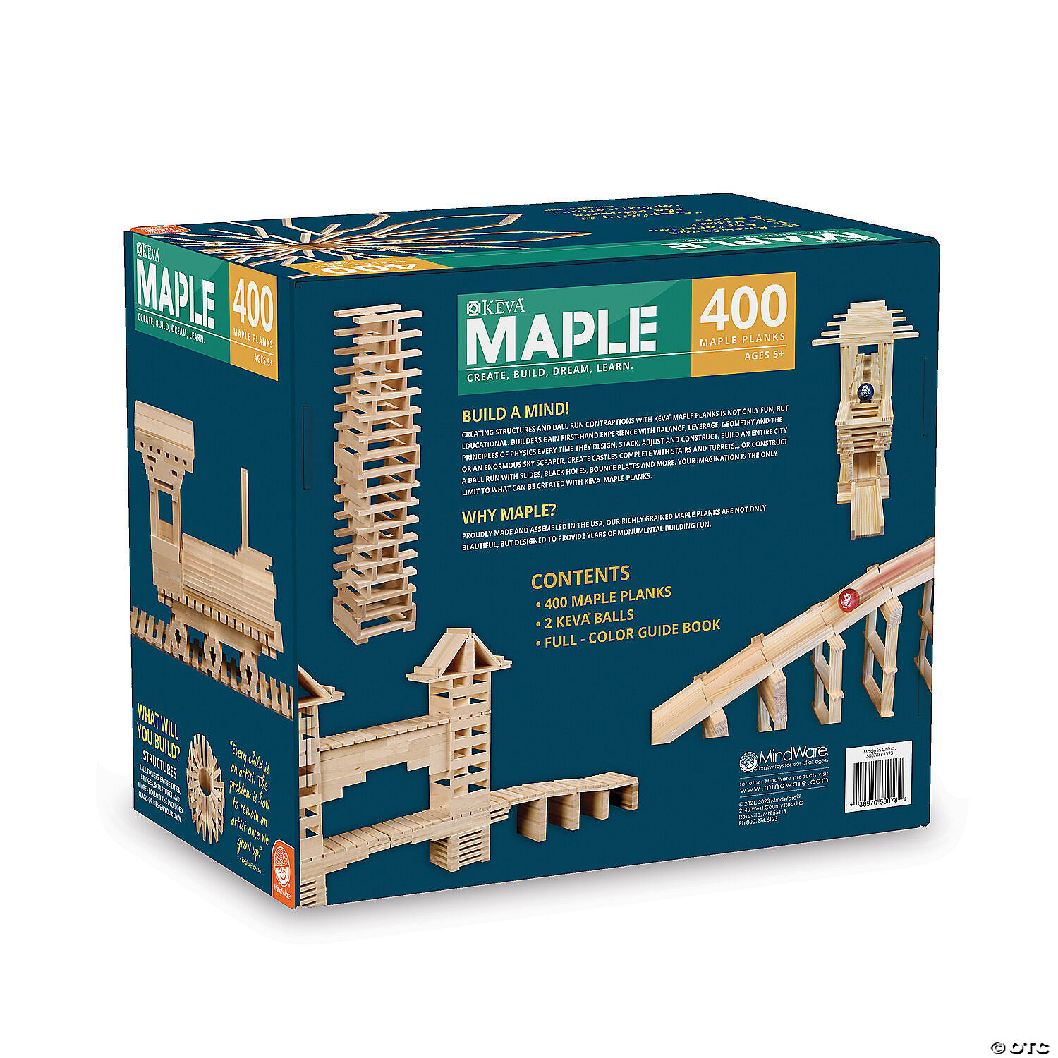 No glue or connectors required...simply stack wood planks to create buildings, monuments and geometric forms. Its the ideal activity to help kids gain an understanding of balance and proportion, as well as an interest in architecture, building and design. A full-color idea booklet with build-out instructions and two lightweight KEVA balls are included. The Benefits of Maple: Premium maple planks are tough, durable and stack perfectly time after time. Beautiful maple wood grain creates works of art.