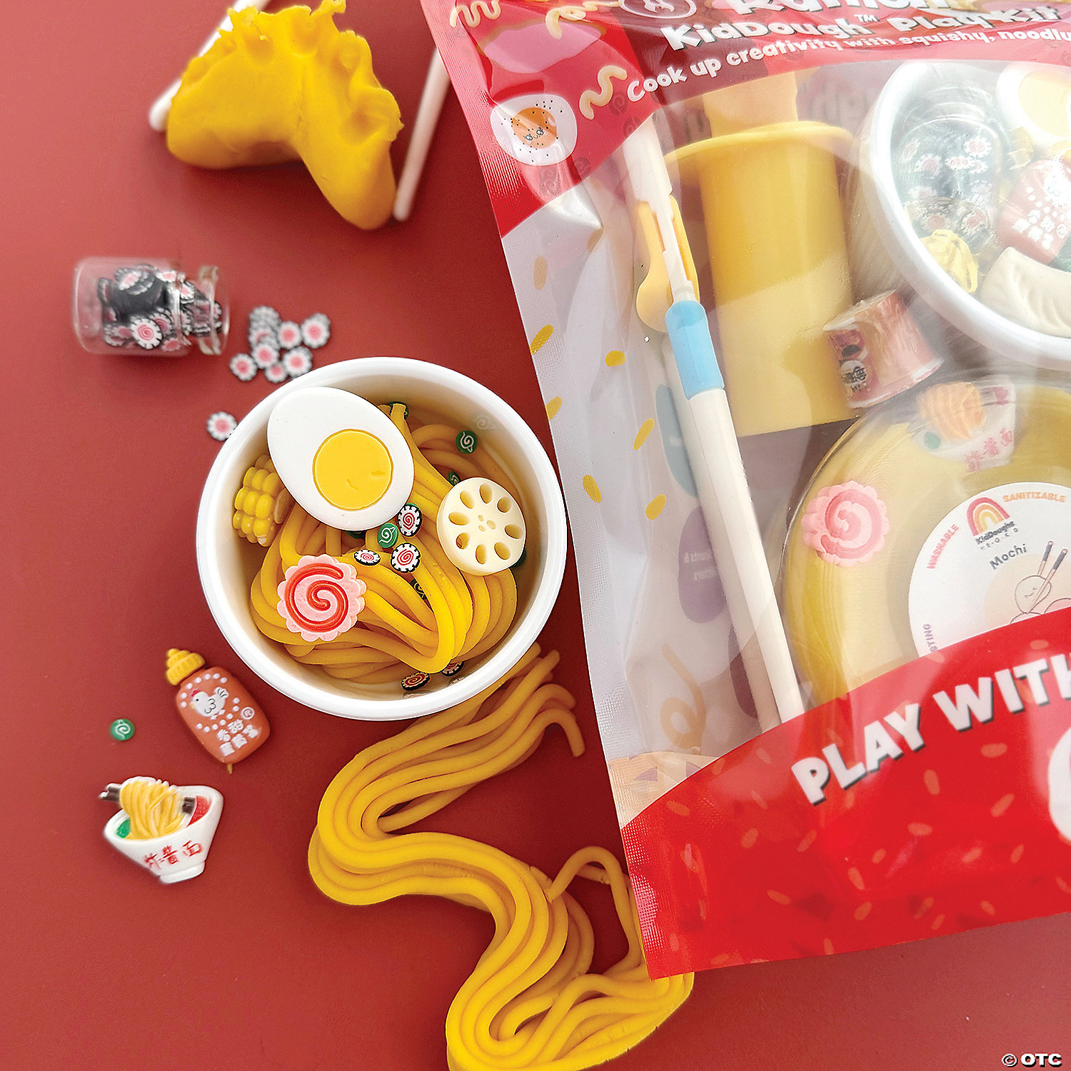 • Includes 8 oz Mango Mochi KidDough, melamine bowl, noodle extruder, chopsticks with trainer, dumpling charm, egg charm, fish cake charm, lotus root charm, ramen bowl charm, ramen figure, ramen packet charm, corn charm, chili sauce charm, green onion fimo, and fish cake fimo