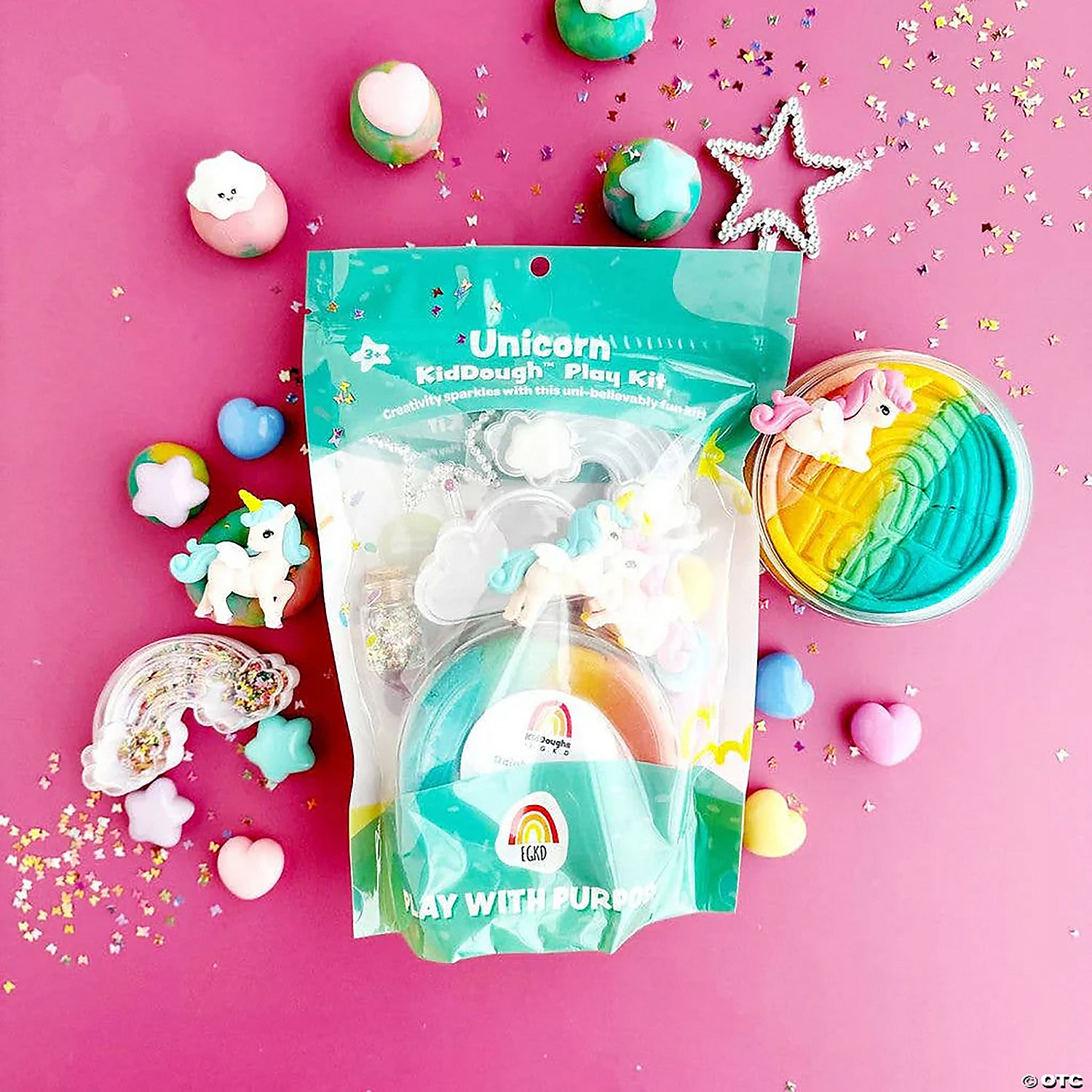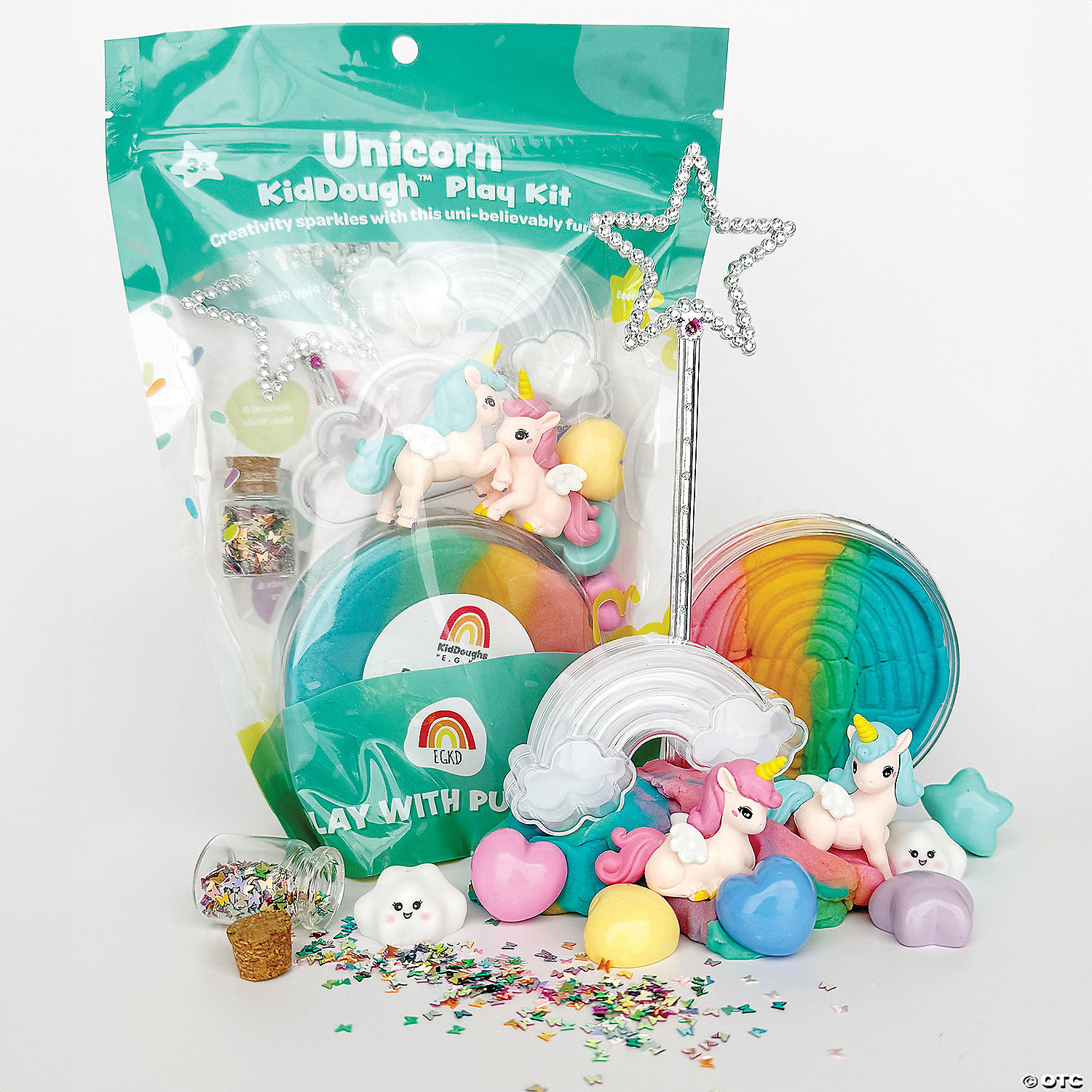 • Includes 8 oz Four-Layered “Rainbow In a Jar” KidDough (rainbow sherbet scented), 2 unicorn figurines, rainbow form, cloud form, smiling cloud charms, pastel star charms, jar of butterfly glitter, and a 5" magical star wand