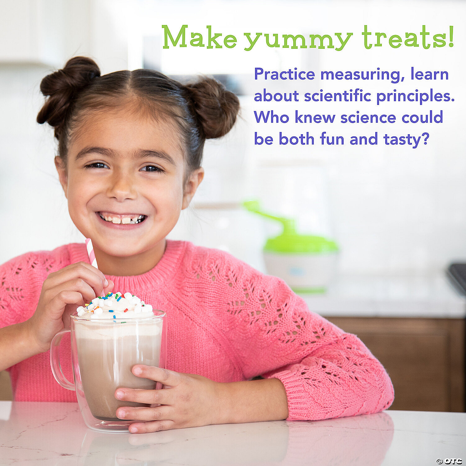 • This innovative kitchen science cooking set for kids uses kid-friendly tools, like a unique hand whipper unit, to make a variety of tasty dishes