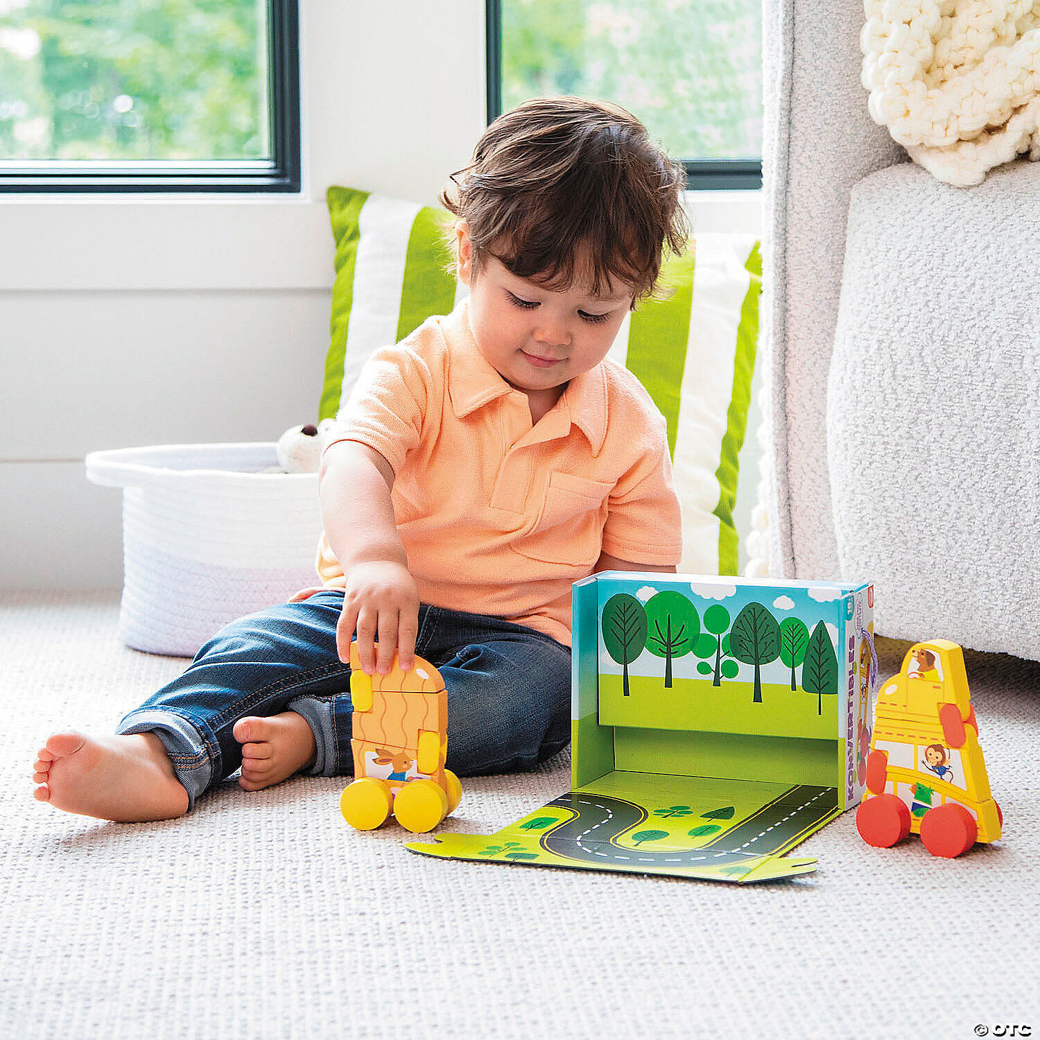 Designed for curious hands and active imaginations, this 2-piece set includes two unique vehicles that encourage cause-and-effect learning, shape recognition, and early motor skills. And when it’s time to hit the road, the included storage box unfolds into a colorful 3-D roadway scene, complete with printed lanes and scenery—no extra play mat needed!