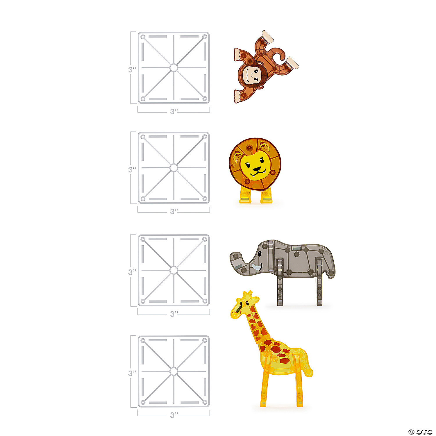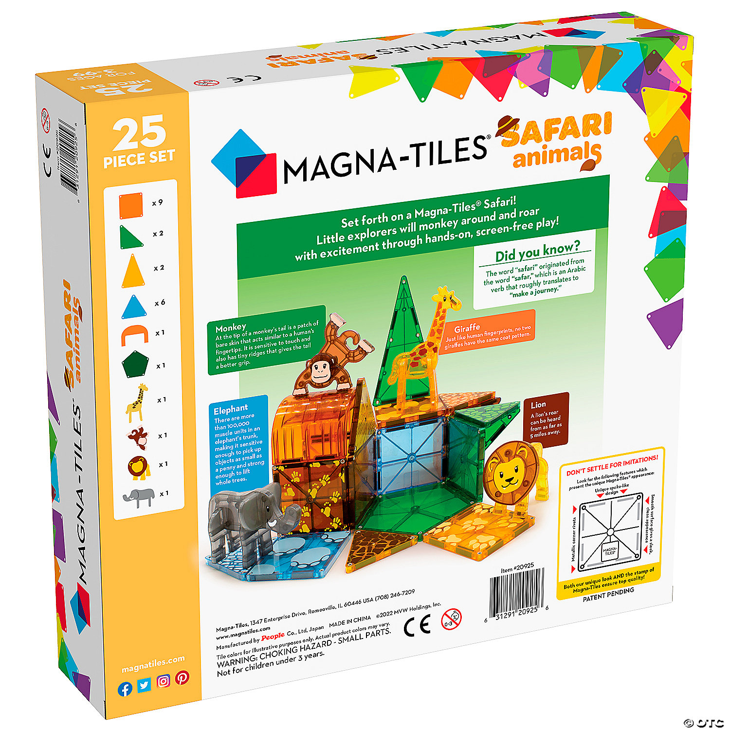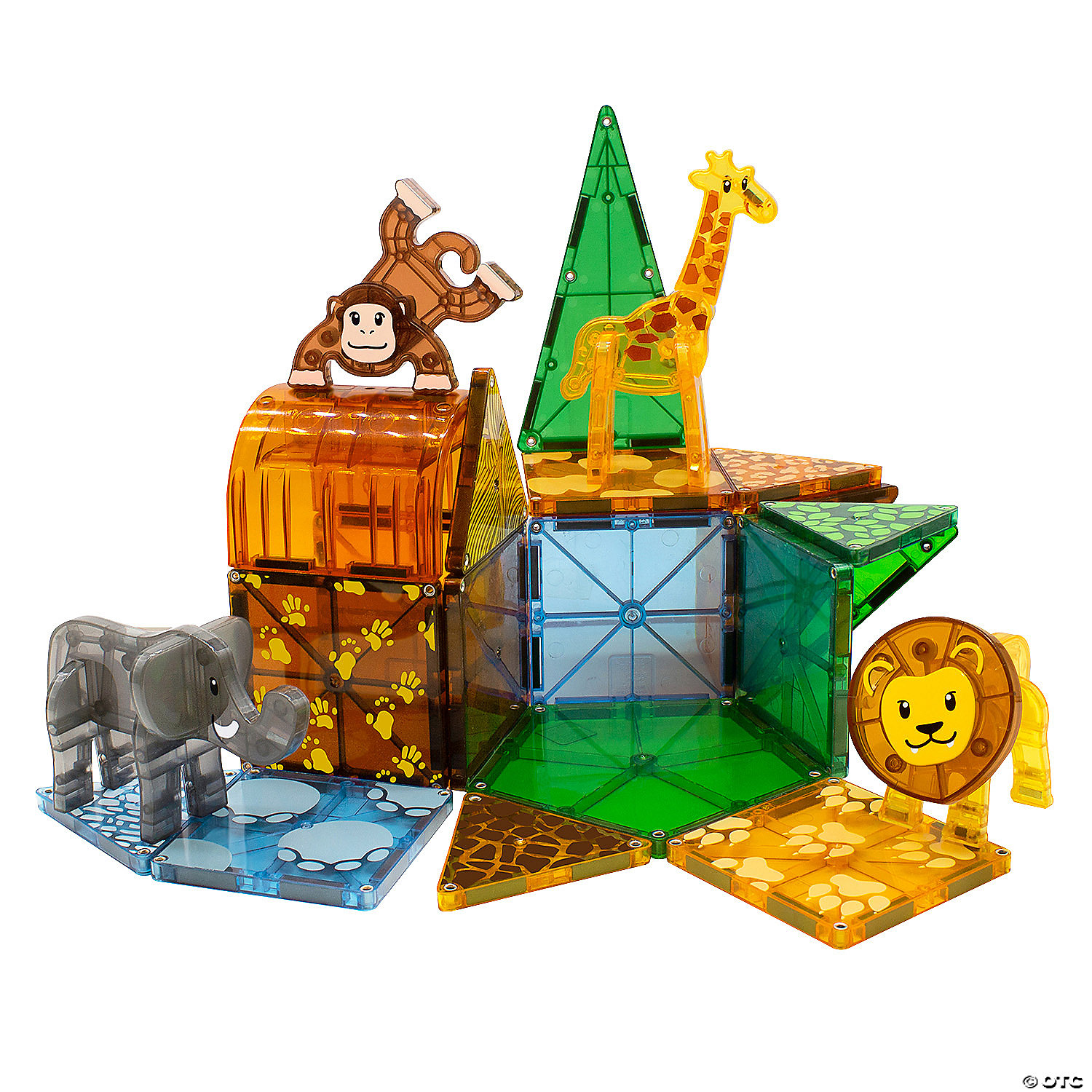 • Includes: 25 magnetic pieces: 4 Safari Figurines (Giraffe, Monkey, Lion and Elephant), 9 Squares, 10 Triangles (2 Right, 2 Isosceles, 6 Equilateral), 1 Arch, 1 Pentagon