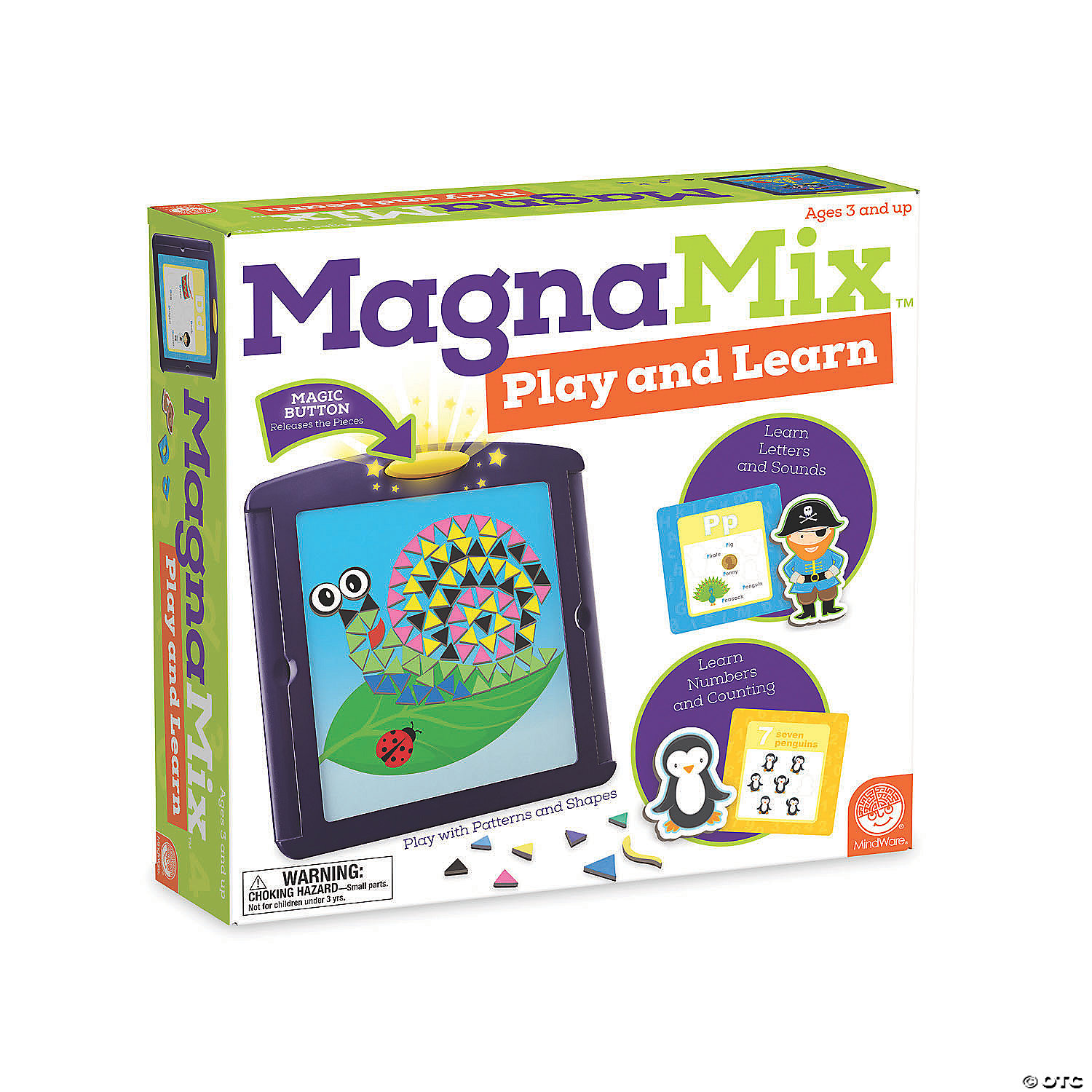 Young children can learn letters and sounds, numbers and counting using this play and learn toy. They can press the magic release button, which will guide them from letter-to-letter, number to number, and pattern to pattern. Use the accompanying magnetic letters and numbers on the screen to strengthen matching and recognition. Play and learning become totally interactive! • MagnaMix Play and Learn Set• Builds number, letter, and pattern recognition to strengthen pre-literacy• Includes Magic Learning Board, assorted puzzle sheets, magnetic shapes, letters, numbers and characters