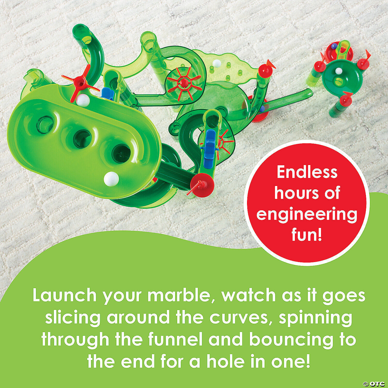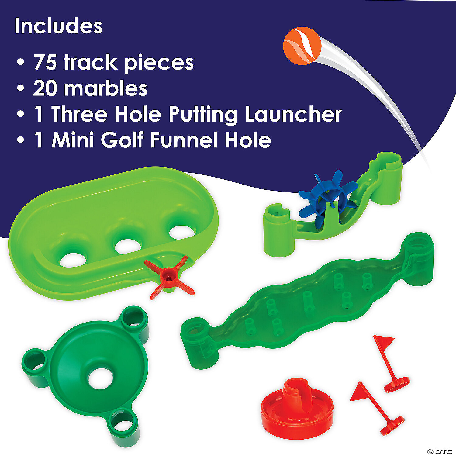 • Includes 75 track pieces, 20 marbles, 1 Three Hole Putting Launcher, 1 Mini Gold Funnel Hole and 5 golf flags
