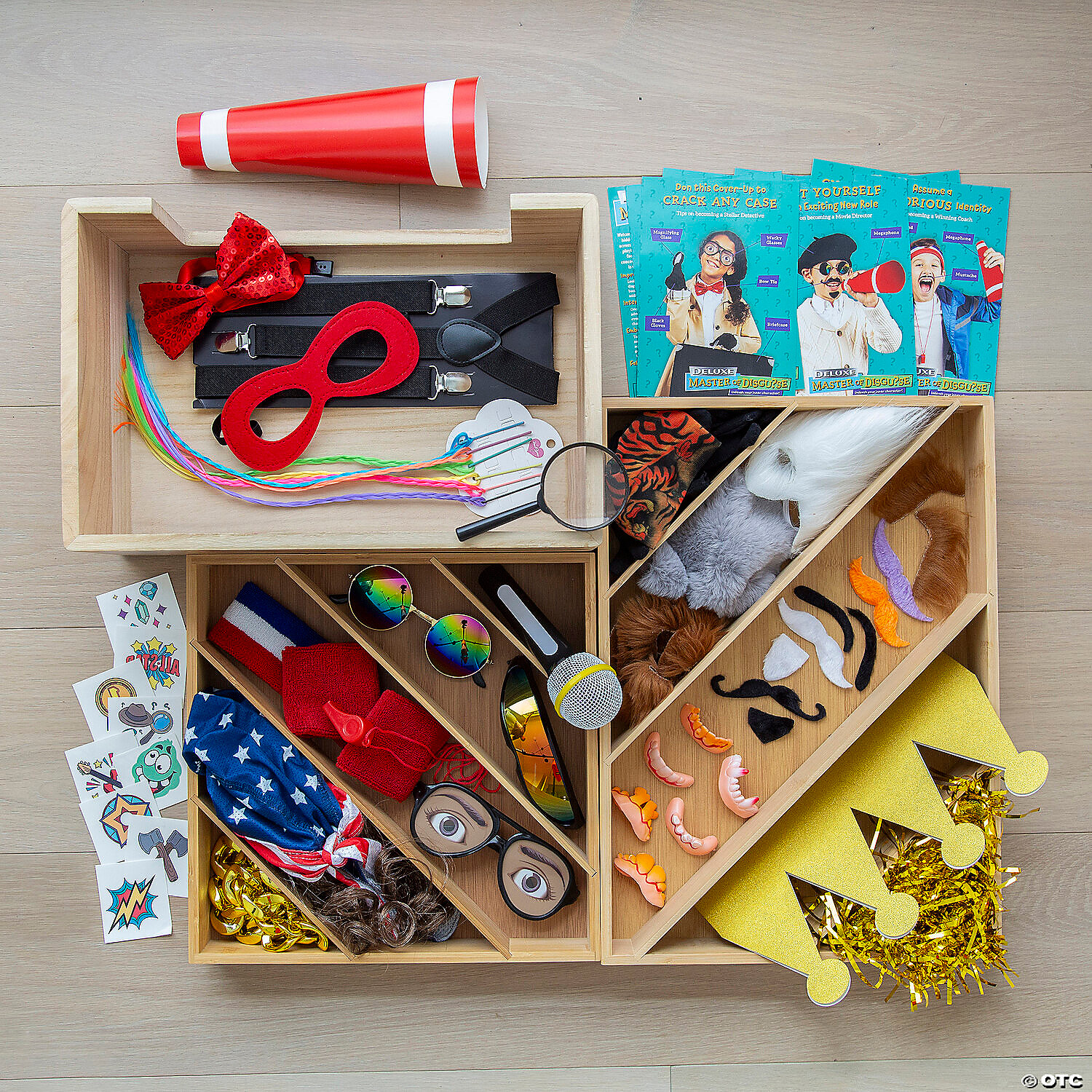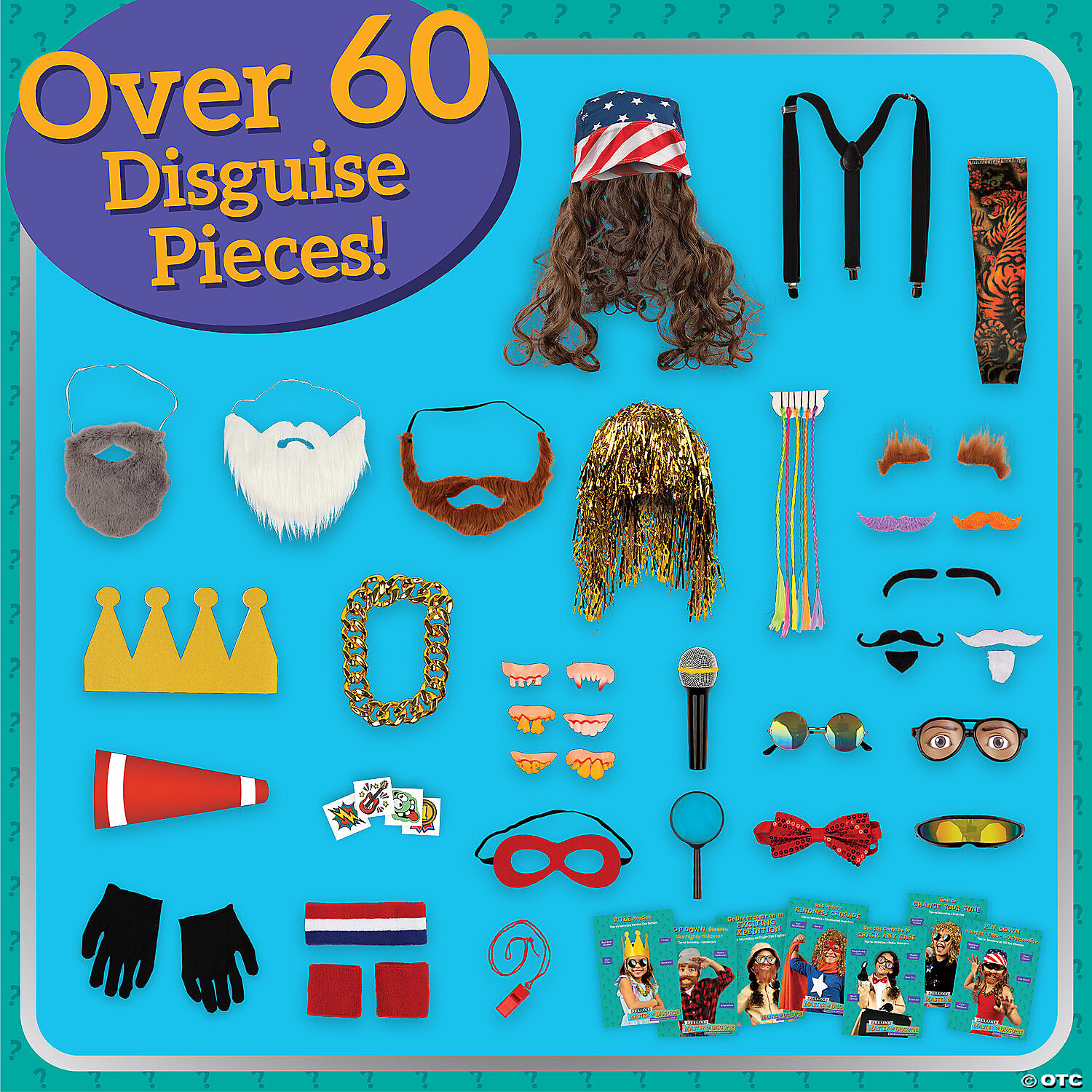 • Includes OVER 60 PIECES including: Tinsel Wig, 3 Beards, Crown, Megaphone, Bandana Hair, Magnifying Glass, Whistle, Black Gloves, Gold Necklace, 10 Temporary Tattoos, Microphone, Suspenders, Pair of Eyebrows, 3 Mustaches, 2 Mustaches and Goatee Sets, 6 Pairs of Fake Teeth, Headband, Wristbands, Tattoo Sleeve, 6 Clip-in Hair Pieces, Bow Tie, Mask, Visor Glasses, Rainbow Glasses, Wacky Glasses, 10 Disguise Cards