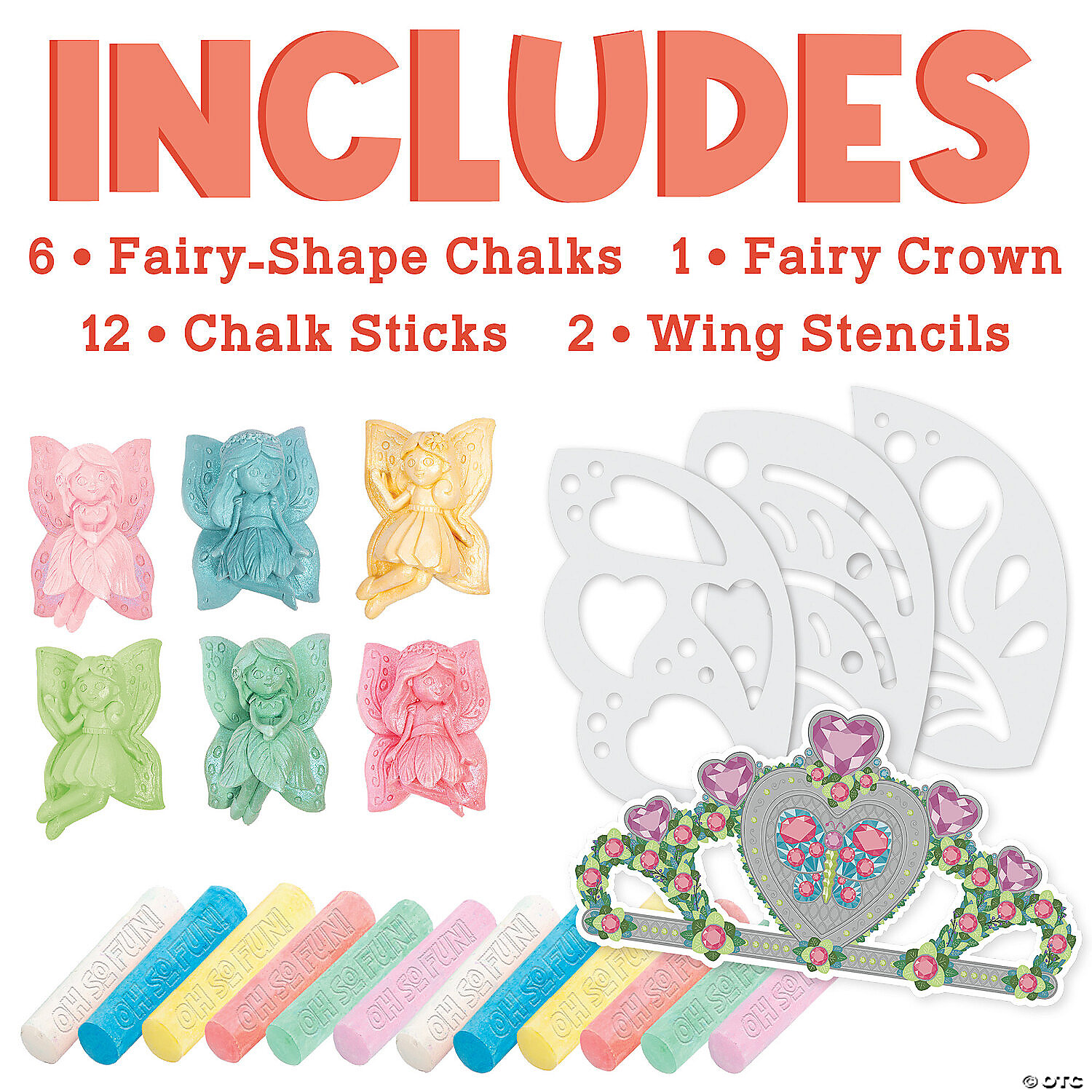 Oh So Fun! Fairy Sidewalk Chalk Set lets kids use their imaginations and included items to become whimsical fairies! Young fans of all things fairies can use the included wing stencils to draw their own fairy wings, then color them in with the chalk in various colors and designs. Beautifully shaped fairy chalk pieces add to the fun as budding artists turn driveways and most any outdoor space into a haven for imaginative play. Hours of imaginative play await as kids frolic the fairy-shaped driveway chalk figures around their chalk-drawn kingdoms!• Oh So Fun! Fairy Sidewalk Chalk Set helps children turn their love of fairies into hours of imaginative play• Develops self-expression, creativity and fine motor skills• Includes 6 fairy-shaped chalk figures, 12 sidewalk chalk sticks, 3 wing chalk stencils, paper crown & instructions with fun outdoor chalk-drawing tips