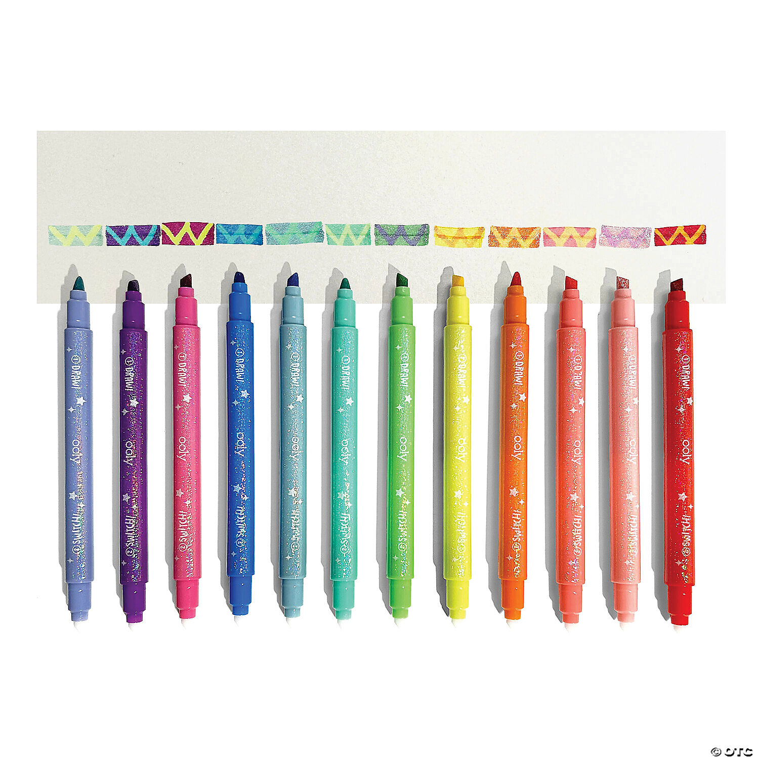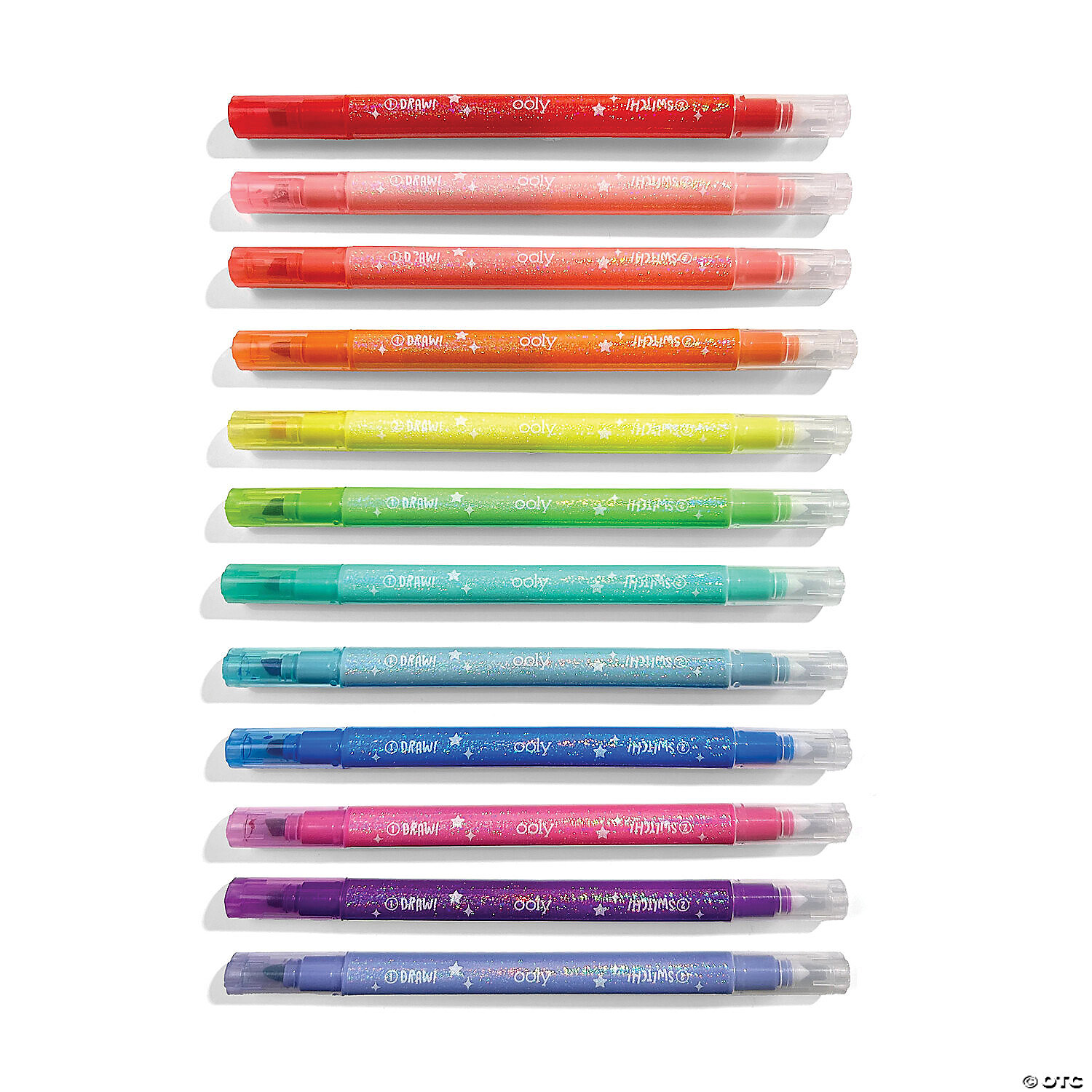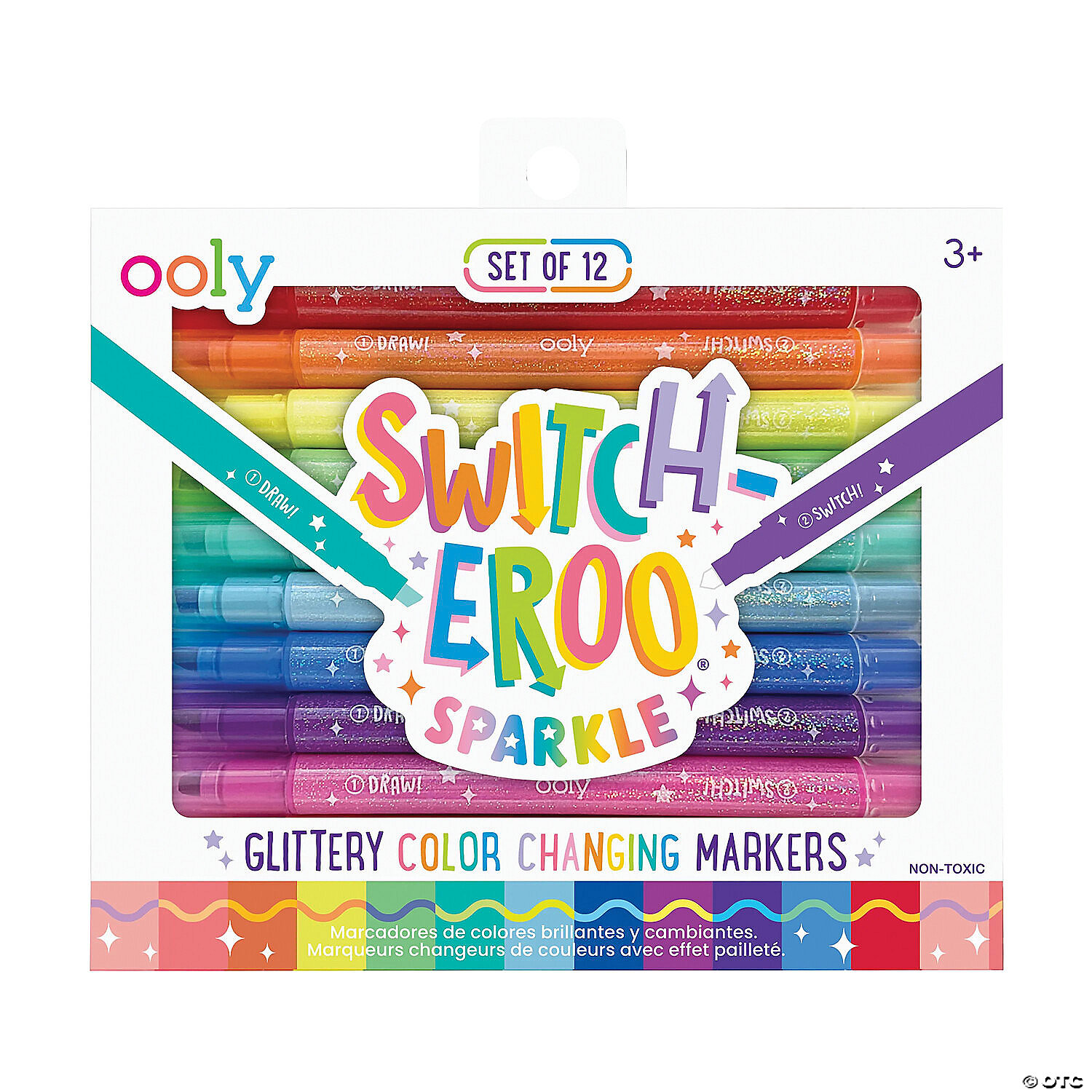 Add a splash of sparkle and a twist of surprise with OOLY’s Switch-Eroo Sparkle Glittery Color-Changing Markers! This set of 12 double-ended markers lets you color with a shimmering glitter hue on one side, then flip to reveal a mystery color on the other. Perfect for creating magical, multi-dimensional designs that shimmer and shift with every stroke. Whether you're highlighting, blending, or layering, these markers bring a whole new level of fun to your art projects. Let your creativity shine and switch up your style with every flip!