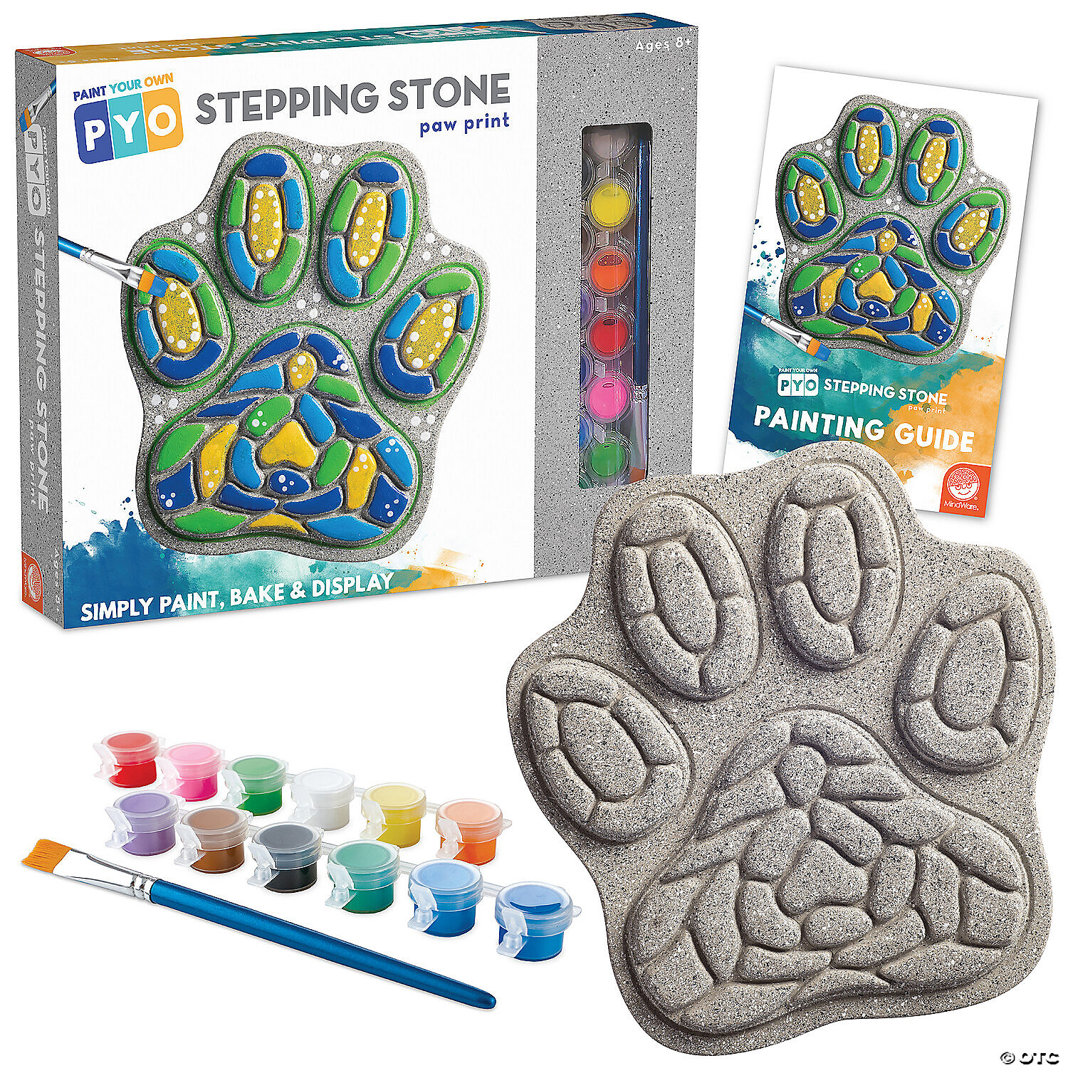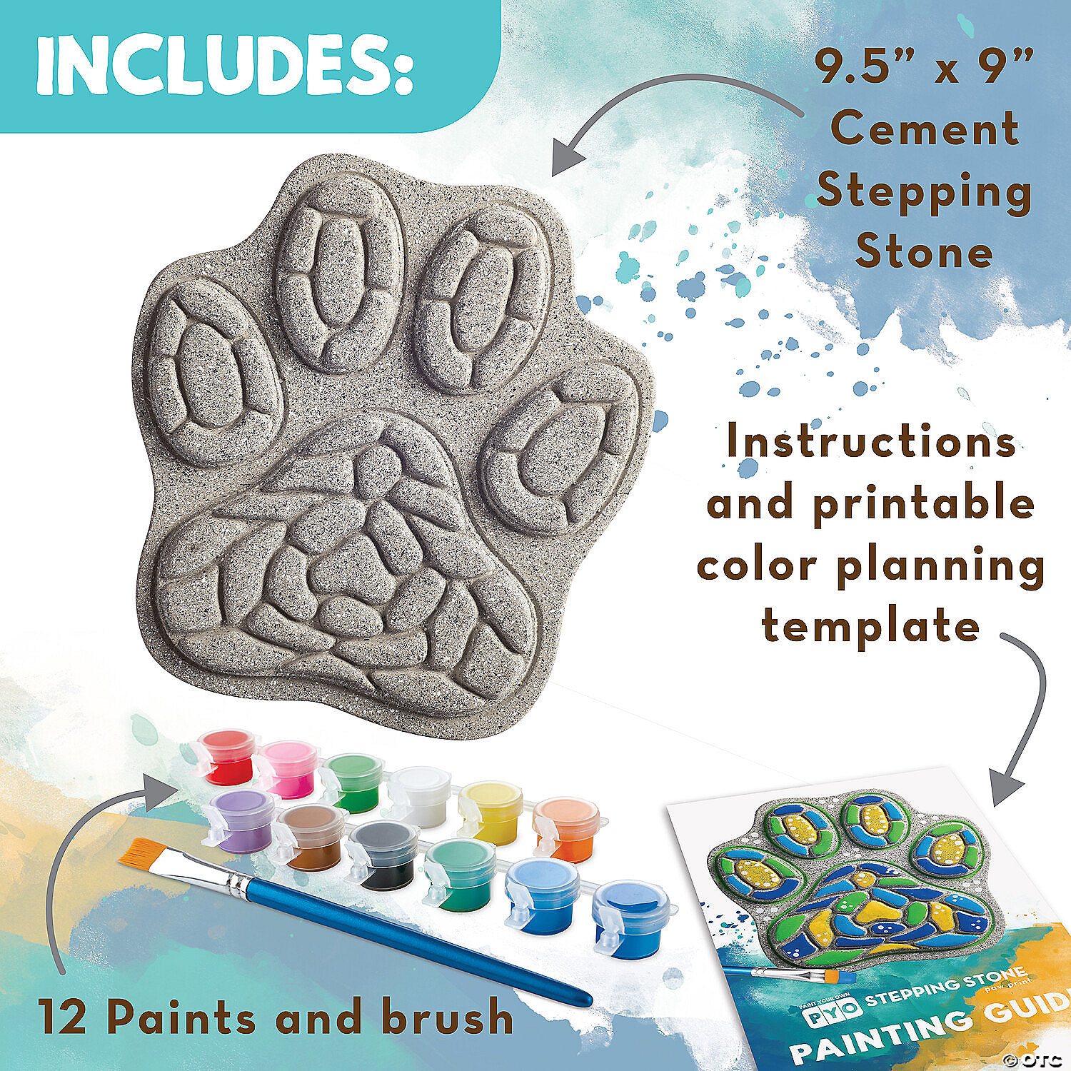 This ready-to-paint stepping stone comes with everything you need to create a beautiful garden or patio accessory, including paints, a paintbrush and an instruction sheet showing you how you can mix colors to develop your own hue! What a great way to encourage creativity while learning about color blends. When you’re done painting, simply bake your stepping stone to help ensure a long-lasting, weather-resistant finish. Paint this paw print stone as a unique gift for dog lovers in your life or display it in your own backyard doggy haven! Kit contains 8.5" x 9" cement stepping stone, 12 paints, a paint brush and painting guide.• Decorate your outdoor living space• Develops creativity, hand-eye coordination and color mixing skills• Weather-resistant finish once baked• 8.5" x 9" cement stepping stone, 12 paints, a paint brush and instructions• Printable color planning templateDownload Color Template