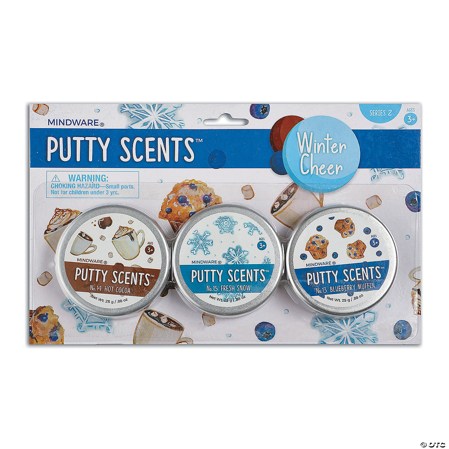 Cozy up with a 3-pack of sensory putty in comforting hot cocoa, fresh snow and blueberry muffin scents! Each tin combines the stress relief of thinking putty and a warm winter fragrance for one of the most soothing fidget toys around! Our soft and pliable putty is the popular sensory tool that’s great for kneading, molding and stretching—with lots of amazing aromas to choose from. Collect them all! Putty Scents make great gifts for teens and adults alike! Gluten free and made from non-toxic ingredients (silicone oil, silicon dioxide, boric acid, pigment & fragrances).• A cozy, calming 3-pack of soft, stretchy, scented putties.• Puts stress relief and aromatherapy at your fingertips.• Includes hot cocoa, fresh snow and blueberry muffin scented putties, each in their own beautiful tin.• Gluten free and non-toxic. • Try the Fall Favorites and Holiday Memories sets, too!