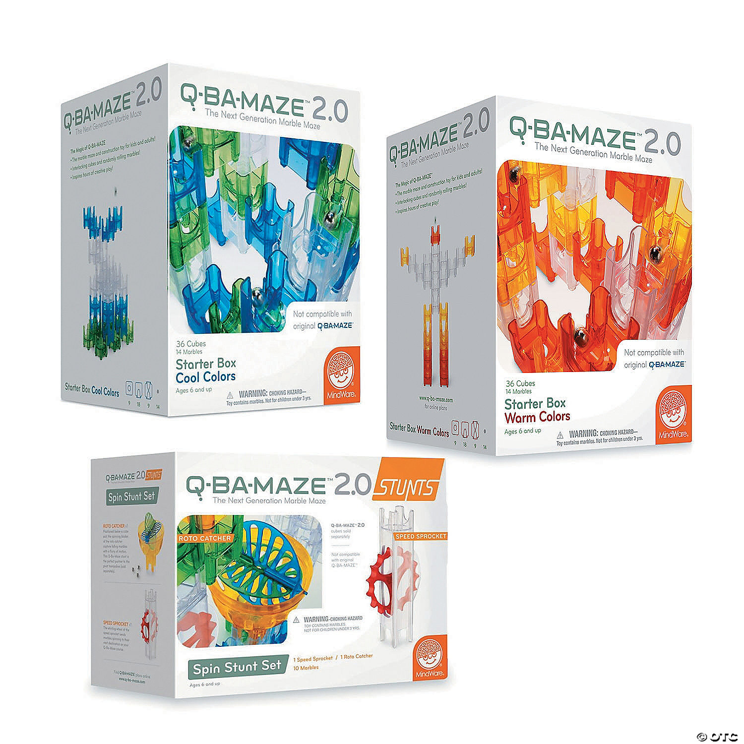 Q-Ba-Maze 2.0 is a unique system of colorful cubes that interlock to form a marble run. The big difference? You can create marble maze sculptures in the form of animals, geometric shapes or any other design! Configurations are unlimited, allowing for unpredictable action when steel balls travel the various routes. Its a live demonstration of probability, physics and art, all in one! This set of 3 contains 36 cubes in "warm" colors, 36 cubes in "cool" colors, 1 Speed Sprocket, 1 Roto Catcher and 38 steel marbles. Made from phthalate-free and BPA-free ABS plastic. Marbles are nickel plated steel balls. They are not magnets.