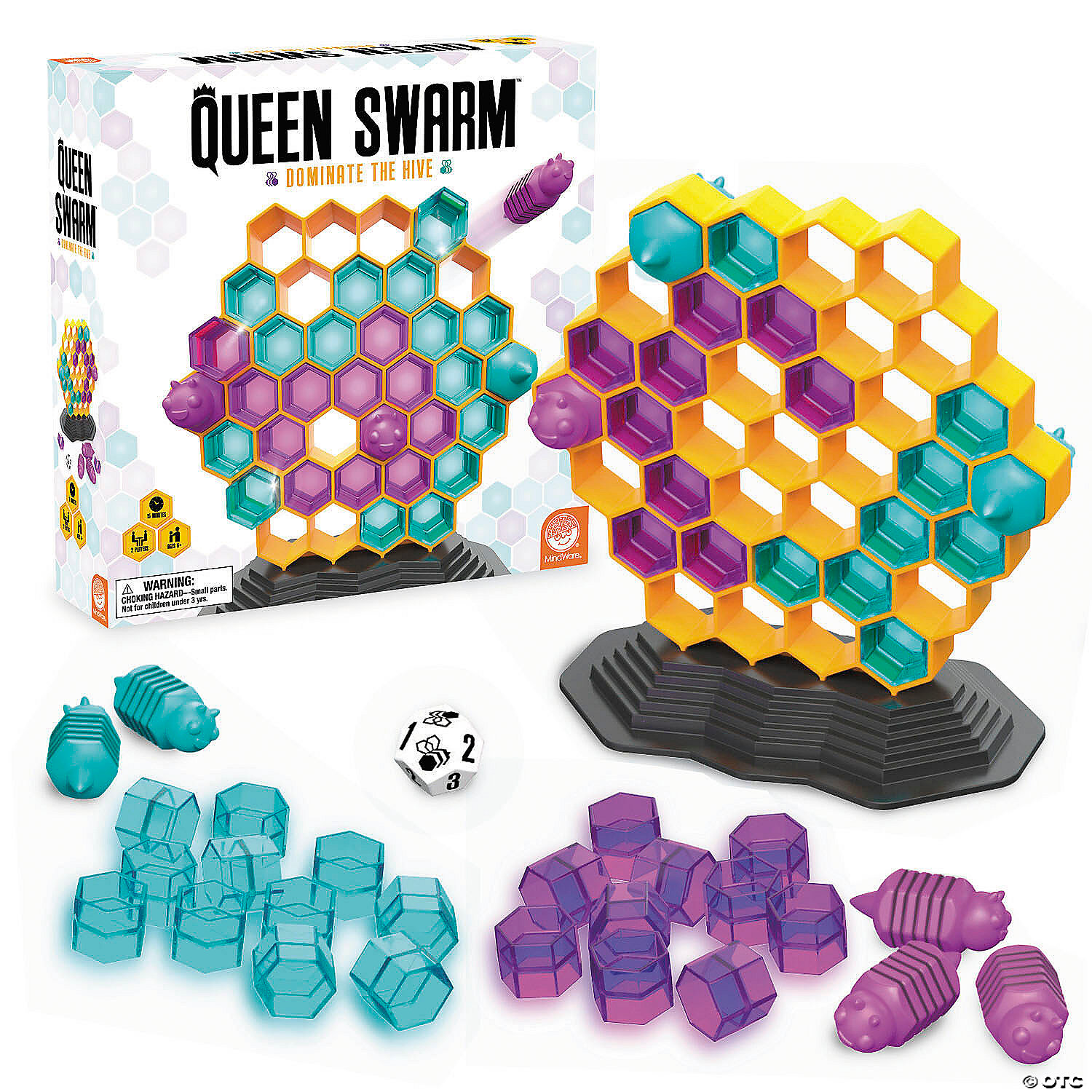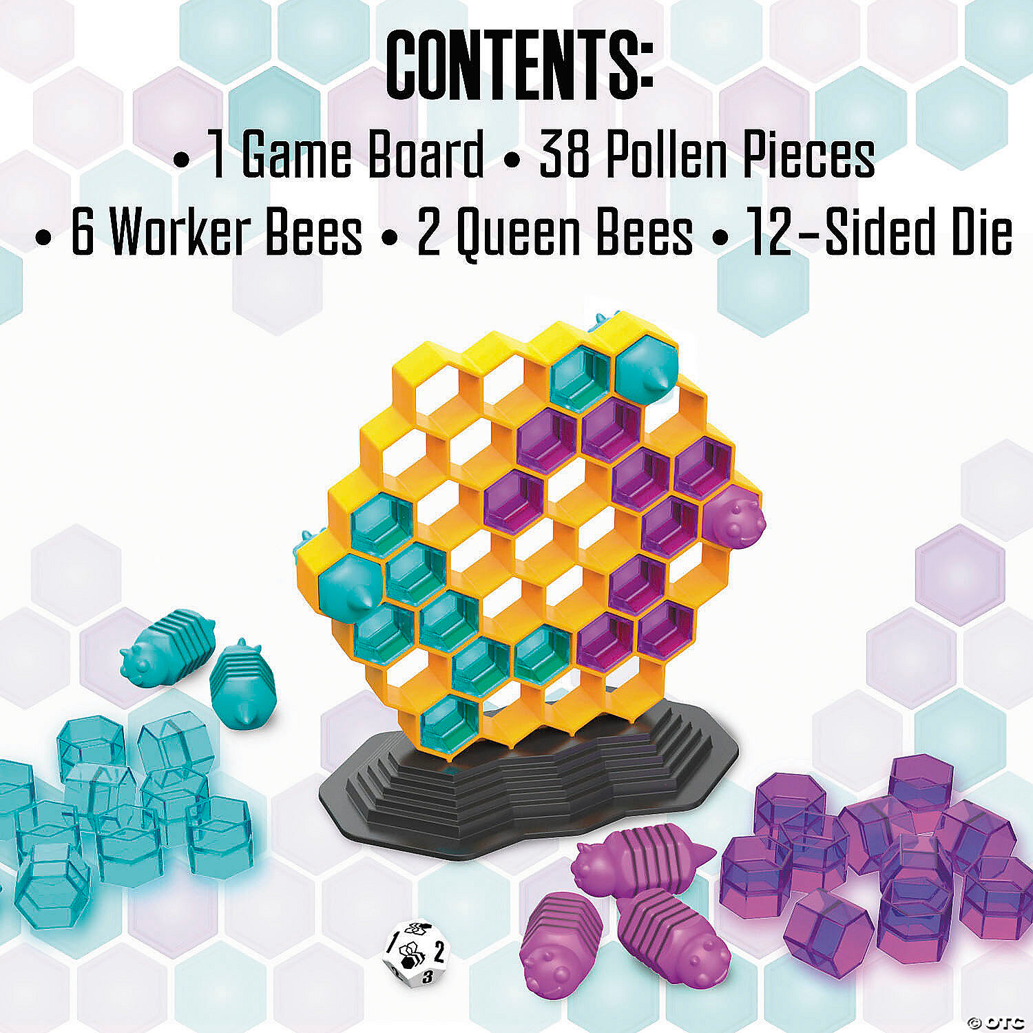 • Includes honeycomb game board, 38 pollen pieces, 6 worker bees, 2 queen bees, 12-sided die, and game rules