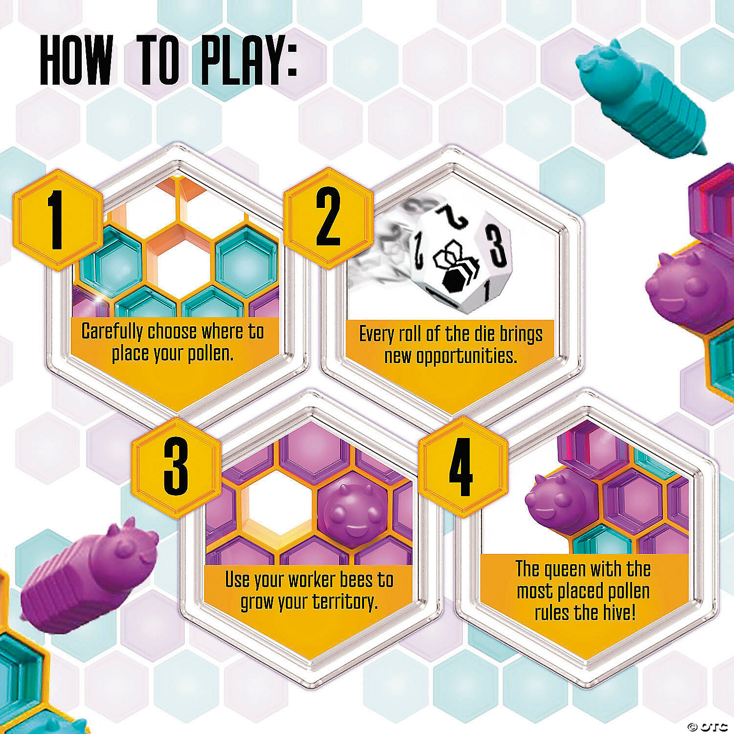 • Compete for control with worker bees, pollen pieces, and strategic dice rolls