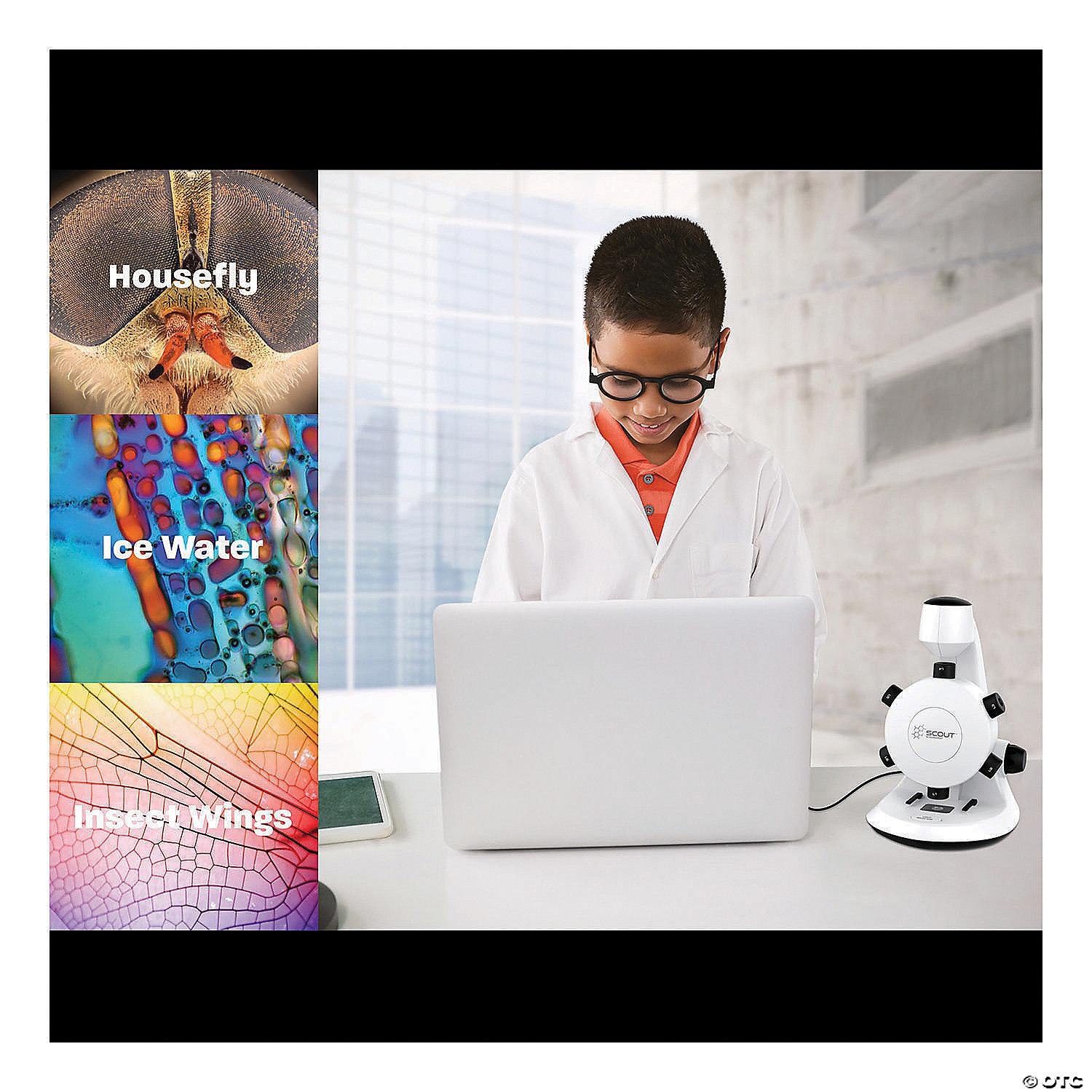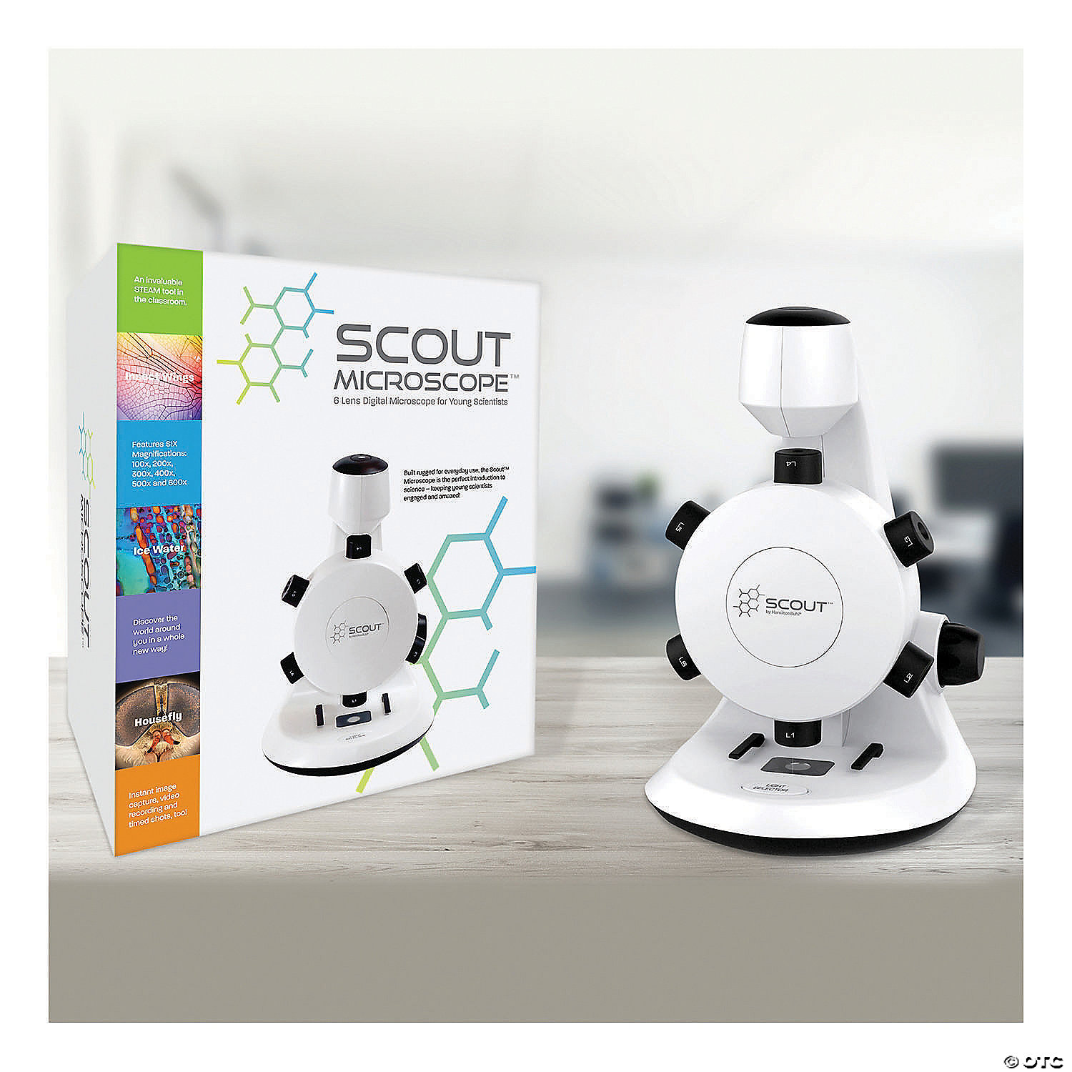 Ignite the sparks of curiosity and fan the flames of interest in science and technology for early learners with Scout™ Digital Microscope from HamiltonBuhl!Built rugged for younger students, Scout™ features six different magnification lenses on a vertical rotating wheel – magnifying to 100x, 200x, 300x, 400x, 500x and 600x best at 1600x1200 resolution monitor.With magnified images or live video displayed on a computer via a USB connection, every student in the classroom will be mesmerized by the fascinating microscopic world around them. Featuring a one-touch snap button for instant image capture as well as video recording and timed shots, Scout™ Microscope will be an invaluable STEAM/STEM tool in the classroom, introducing the fascinating world of science to students.Included In The Box:(1) Digital Microscope with integrated turret with six different magnification level lenses and USB cable(3) Blank specimen slides(1) Prepared slide with cotton swatch(6) Specimen covers(1) Tweezers(1) Dropper(1) User Manual(1) Installation CDSpecifications:• Sensor: CMOS• Max. Still-Image Resolution: 1600 x 1200 pixels (UXGA)• Max. Video Resolution: 640 x 480 pixels (VGA)• Still-Image Format: JPG• Video Format: AVI• Magnification Range: 100x – 600x on 17” Monitor• Illumination: Upper and Lower LED• Connection: USB 2.0• OS Compatibility: Mac OS X 10.5.6 – 10.13.X or Windows XP, Vista, 7, 8 and 10• Power Supply: 5V / 250mA (via USB)