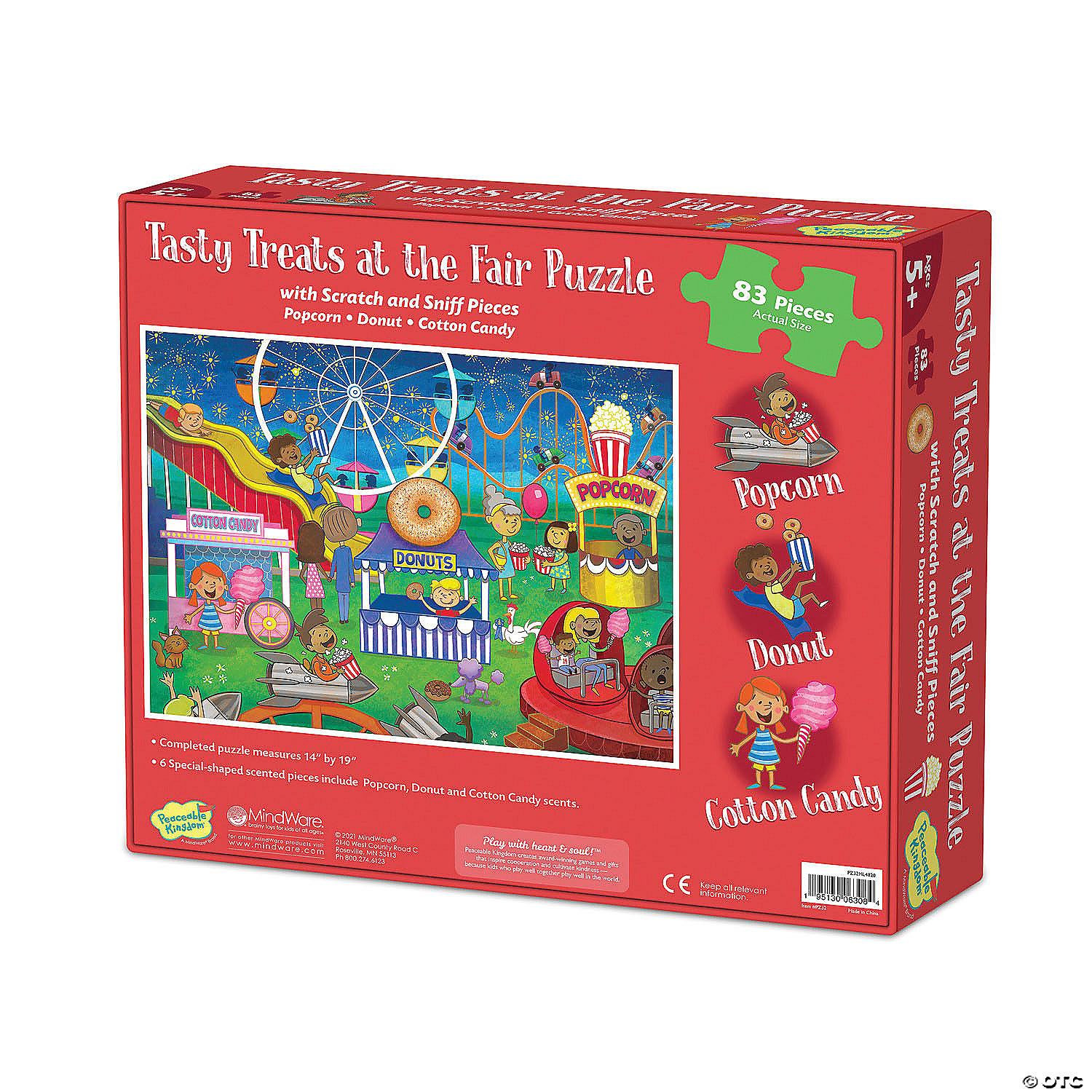 Experience multi-sensory fun with scratch and sniff puzzles! Engaging to put together, the silly final scene is a delight when the puzzle is complete. Create an adorable county fair scene complete with thrilling characters in popcorn, donut and cotton candy scents.• Put together a scratch-and-sniff scene with colorful pieces and sweet scents• Kids learn visual and scent recognition, fine-motor development, problem solving and critical thinking• 82-piece puzzle measures 14" x 19" when complete!• Enjoy other scratch-and-sniff puzzles: Jelly Jammers Rock Monsters, Sweet Smells Bakery, Tasty Treats at the Fair, Candy Kingdom or Fruity Pool Party• Special-shaped scented pieces include popcorn, donut and cotton candy scents