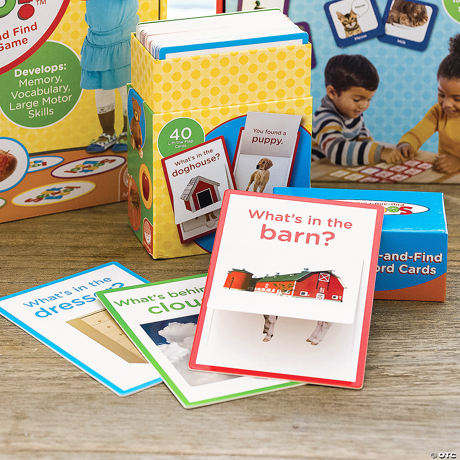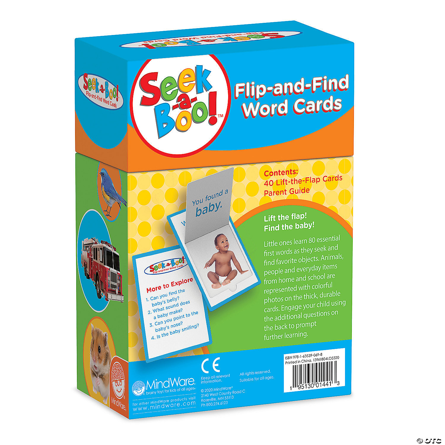 Toddlers and preschoolers love these interactive flip-and-find cards made just for them! Fans of the Seek-A-Boo Seek-and-Find early-learning memory game will love these word cards that incorporate the real photos. Explore each card with your child by lifting the flaps to find the hidden pictures. You can use the questions on each card to help your child count, find colors and do actions. Cards come in four learning categories: On the Farm, Outdoors, At School and Around the House. Includes a parent guide that provides instructions on how to adapt the cards for older or younger children with focus on color and letter recognition, memory, and adding more physical movement. The learning is endless!