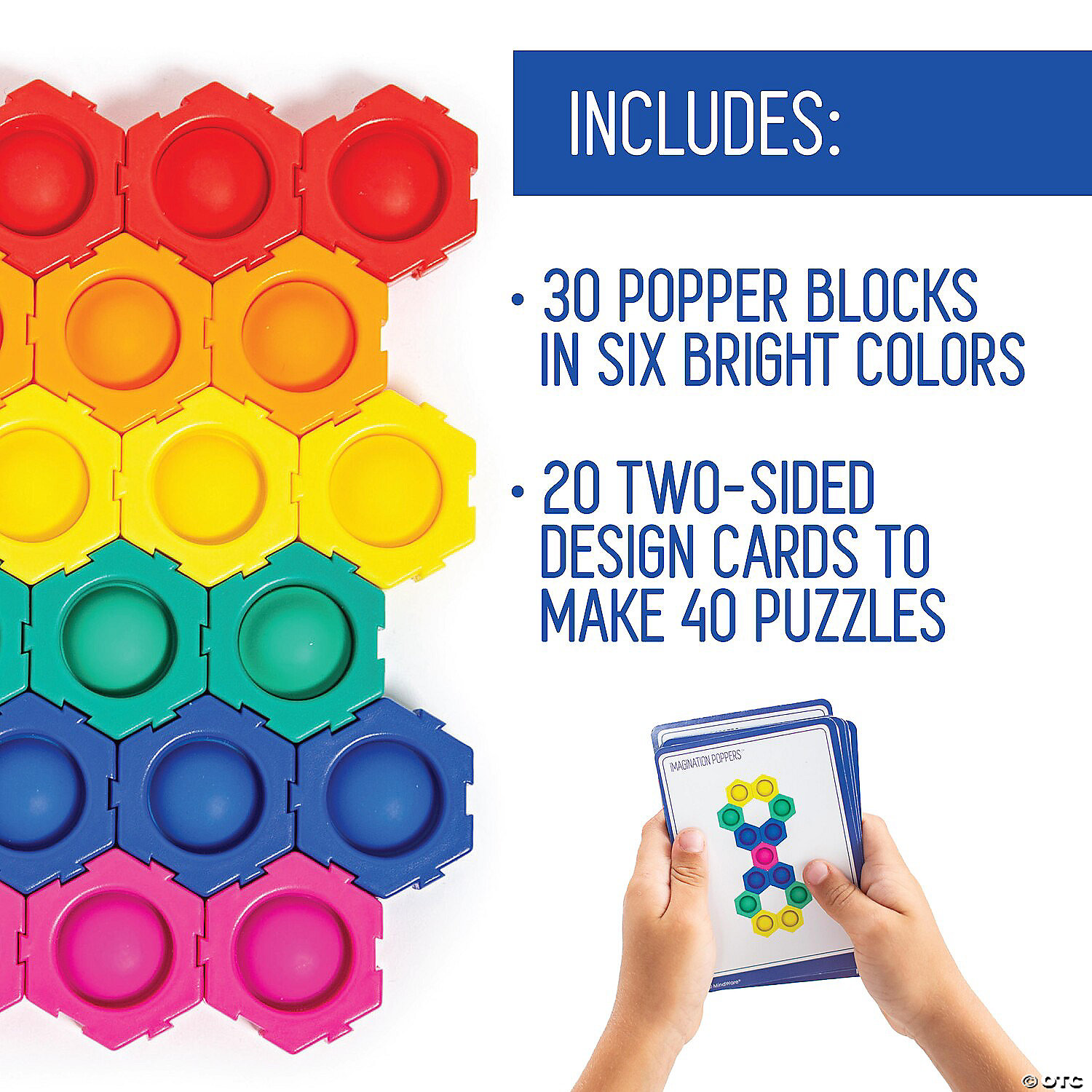 Slide these pieces into place to build your own sensory popper! Follow one of the 40 included design builds or let your imagination run wild on your own creation, then start all over again for hours of sensory enjoyment. Makes a great gift for students and anyone else who could use a hefty dose of creativity, focus and tactile fun! Includes 30 poppers, 5 each of 6 colors, and 20 two-sided design cards (40 puzzles).• Includes 30 popper blocks (5 each of 6 colors), 20 two-sided design cards to make 40 puzzles• Improve focus at home, school or work