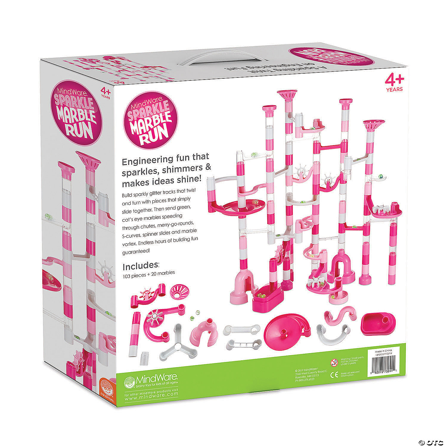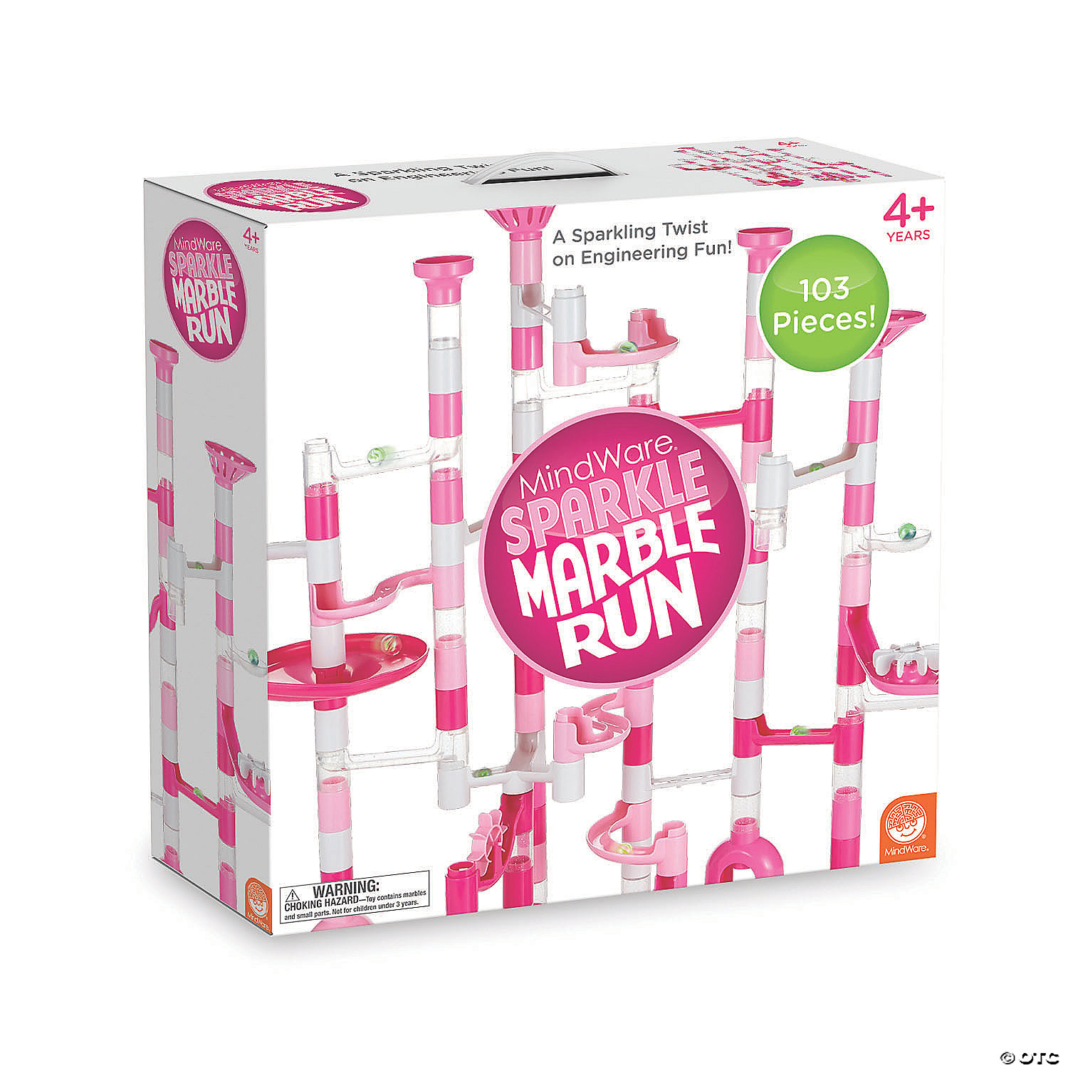 It’s princess-pink meets architectural-engineer! Build pink glitter tracks that twist and turn with pieces that simply slide together. Then send green, cat’s eye marbles speeding through chutes, merry-go-rounds, S-curves, spinner slides and marble vortex. Endless hours of sparkling fun guaranteed!• Teaches logic, creative play, basic physics, fine motor and problem-solving skills• Set up multiple entry points to create an exciting marble race• Comes in a sturdy box with carrying handle for easy storage and travel • Mid-sized marble run includes 103 durable pieces and 20 marbles