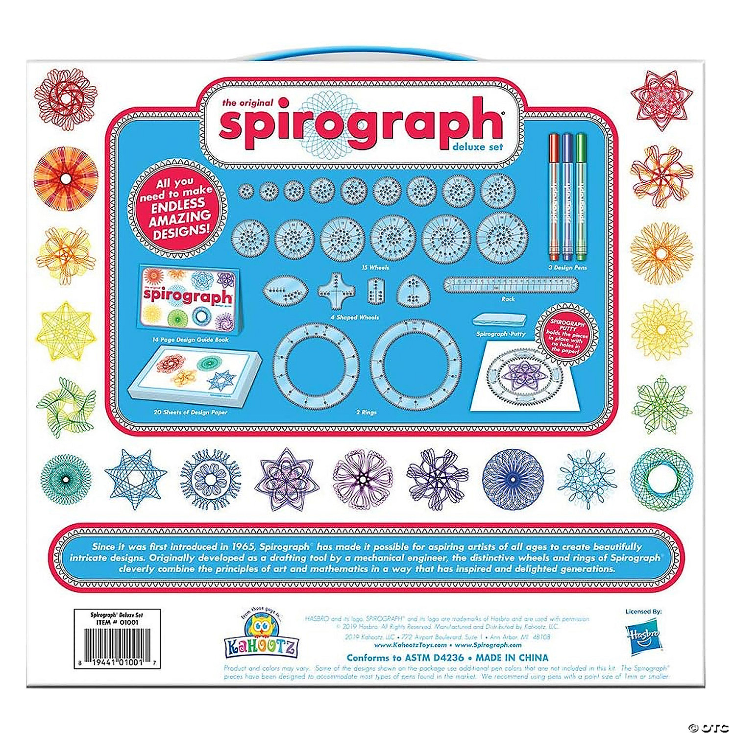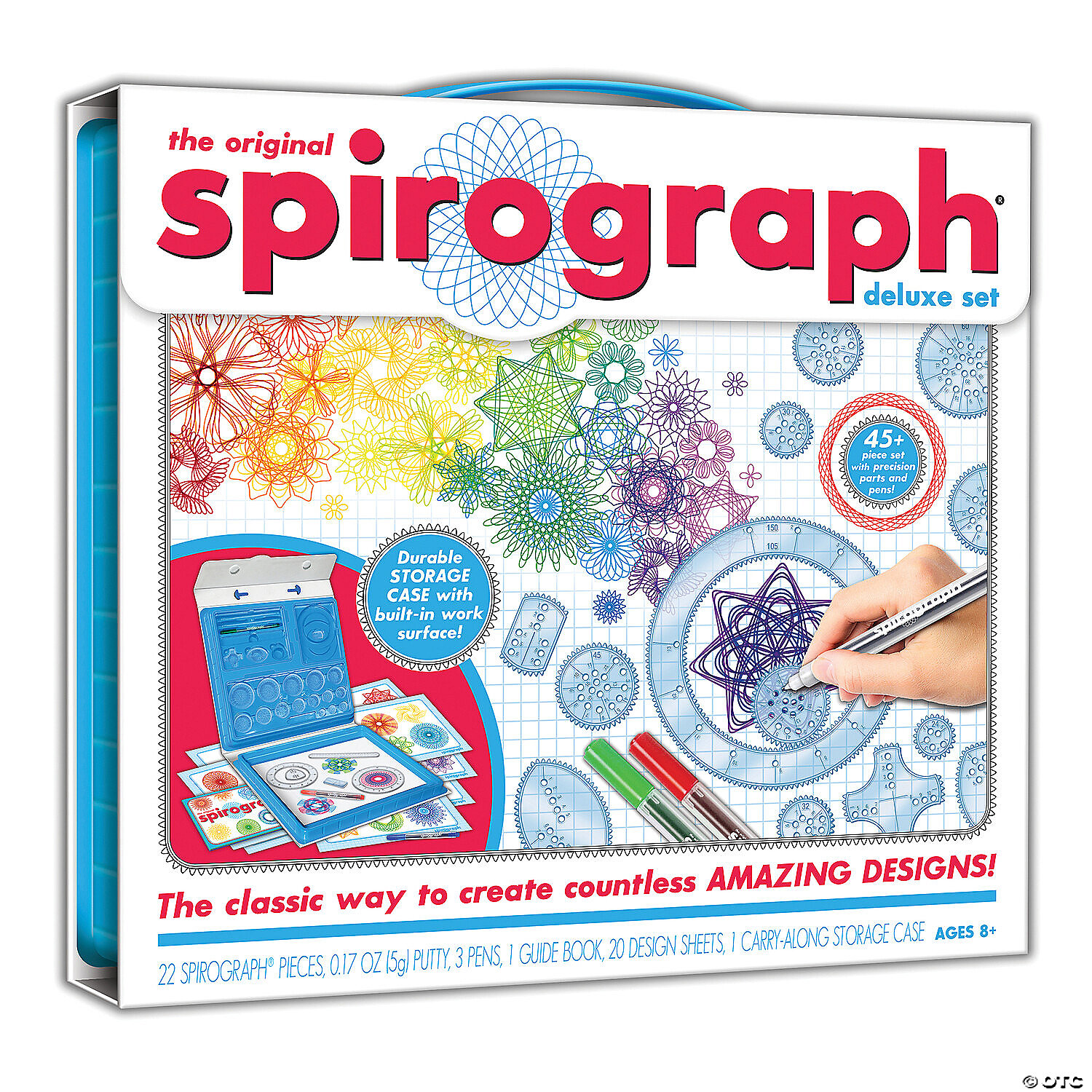 Create stunning designs with this innovative STEAM activity that brings together the worlds of art and mathematics. Spirograph gears work seamlessly with most standard pens, markers and pencils, giving you the freedom to design in any color and style. Take your creativity on the go thanks to the compact and durable carrying case that doubles as easy storage at home or in the classroom. This comprehensive deluxe set has everything you need to dive into the world of Spirograph artistry and create beautiful designs!• Creative activity works with most standard pens, markers and pencils to create mesmerizing spiral designs • Sparks imagination, develops artistic skills and encourages an interest in STEAM concepts• Includes 22 Spirograph pieces, putty, 3 design pens, carry-along storage case, 20 sheets of design paper and a full-color design guide with step-by-step instructions