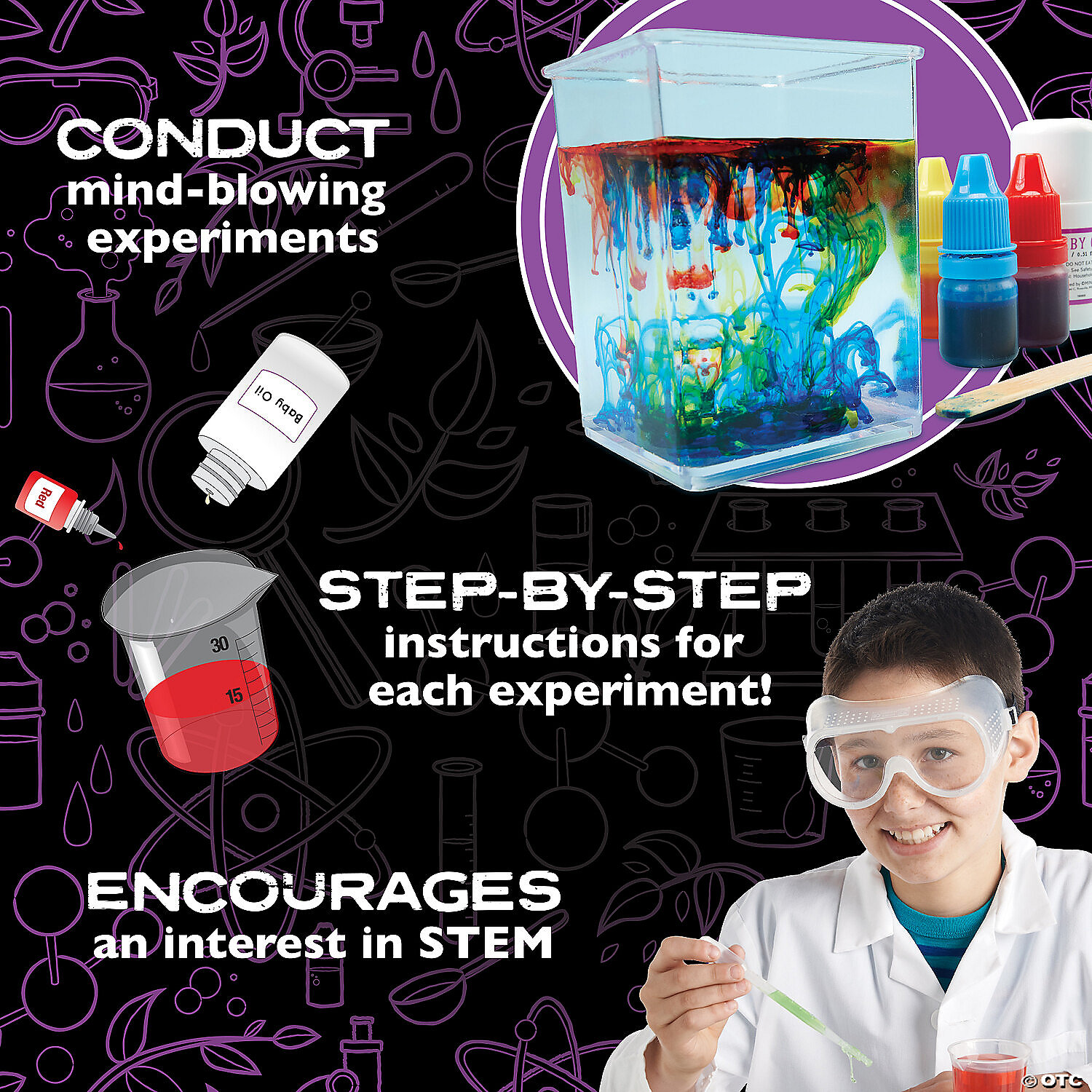 • Includes baby oil, magic sand, sea salt, cornstarch, sodium polyacrylate crystals, red coloring, blue coloring, yellow coloring, neon orange paint, 5 extra-large test tubes, Erlenmeyer flask, 110 mL beaker, square container, small spoon, large spoon, 2 pipettes, absorbent paper, 2 clear straws, 3 stirring sticks, string, modeling clay, cube mold, 3 filter papers, 4 balloons, hex nut, 3 small vials, gloves, goggles, multi-level lab station and guide book.